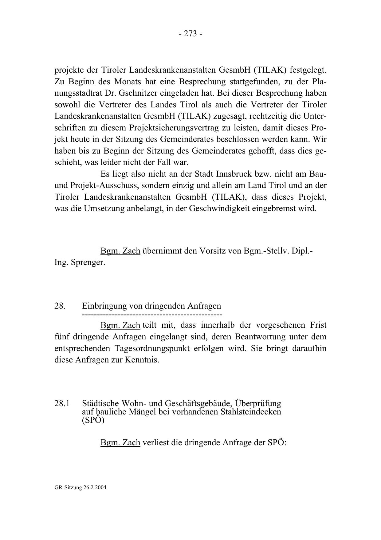 Bgm. Zach verliest die dringende Anfrage der SPÖ: