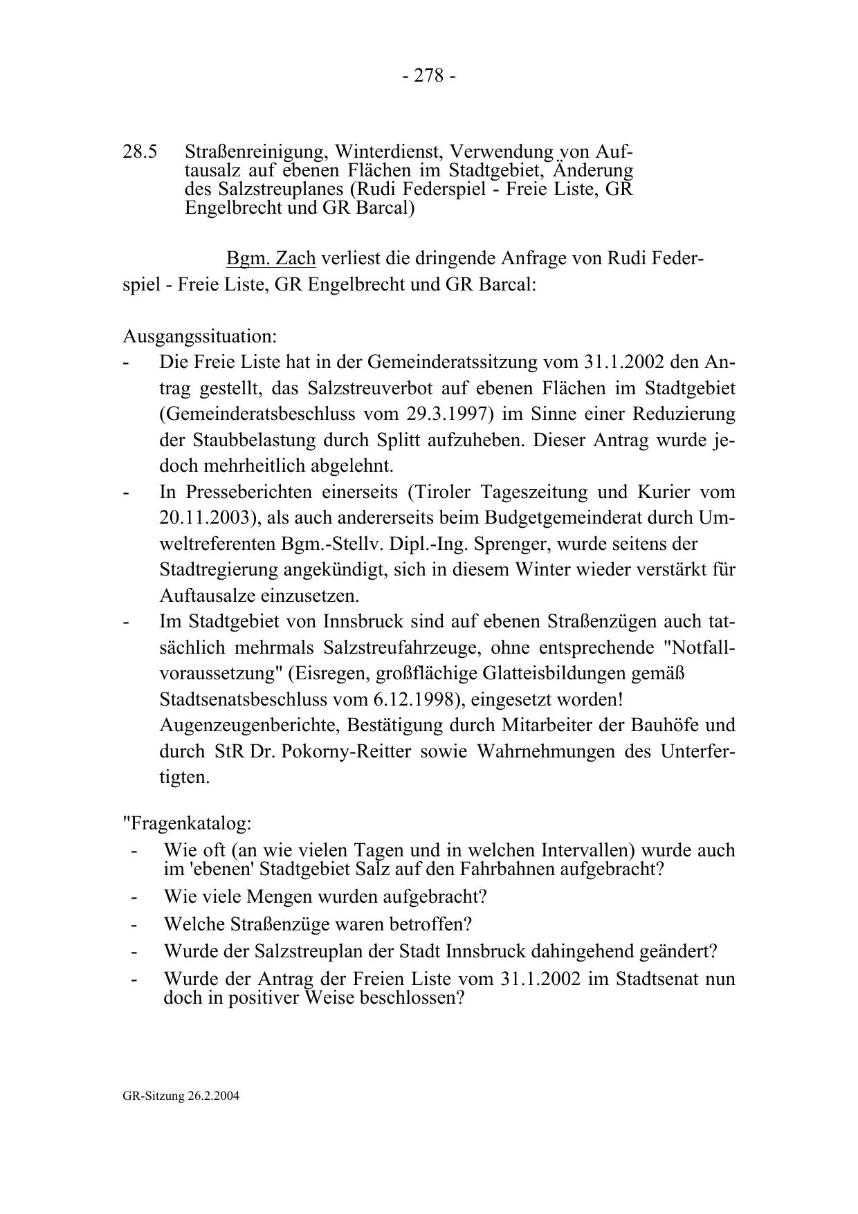 - Die Freie Liste hat in der Gemeinderatssitzung vom 31.1.2002 den Antrag gestellt, das Salzstreuverbot auf ebenen Flächen im Stadtgebiet