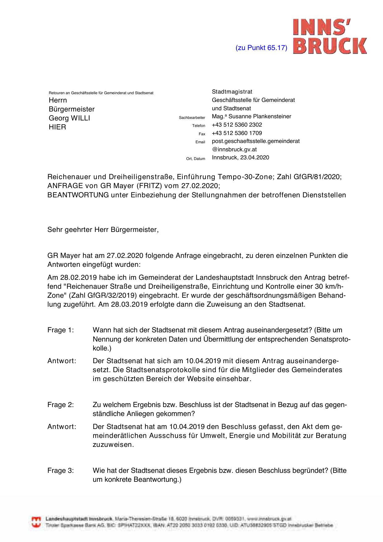Am 28.02.2019 habe ich im Gemeinderat der Landeshauptstadt Innsbruck den Antrag betreffend "Reichenauer Straße und Dreiheiligenstraße, Einrichtung und Kontrolle einer 30 km/hZone" (Zahl GfGR/32/2019) eingebracht. Er wurde der geschäftsordnungsmäßigen Behandlung zugeführt. Am 28.03.2019 erfolgte dann die Zuweisung an den Stadtsenat.