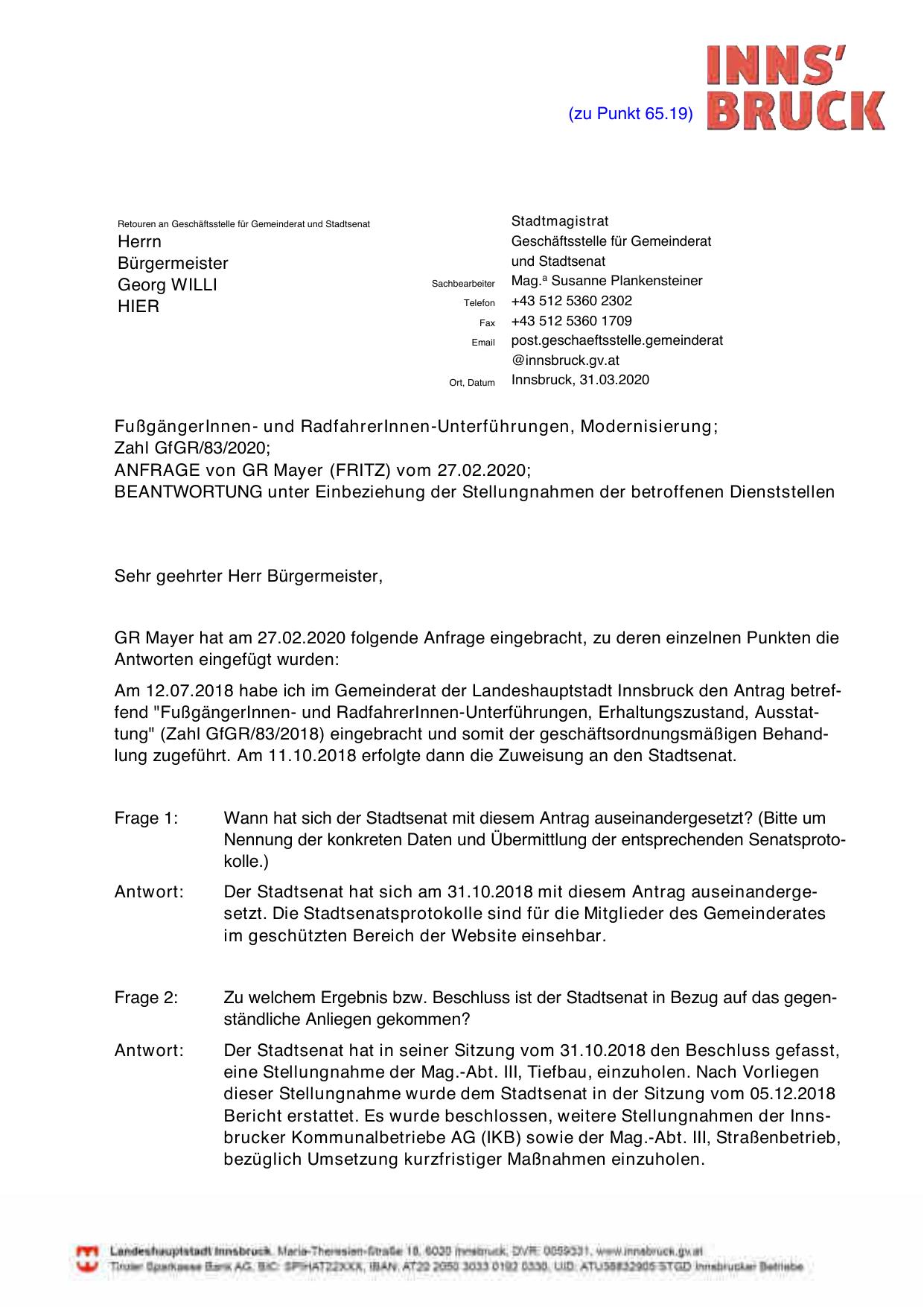 ANFRAGE von GR Mayer (FRITZ) vom 27.02.2020;