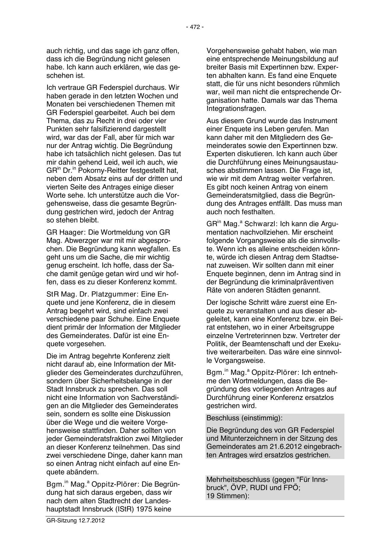 Mehrheitsbeschluss (gegen "Für Innsbruck", ÖVP, RUDI und FPÖ;
