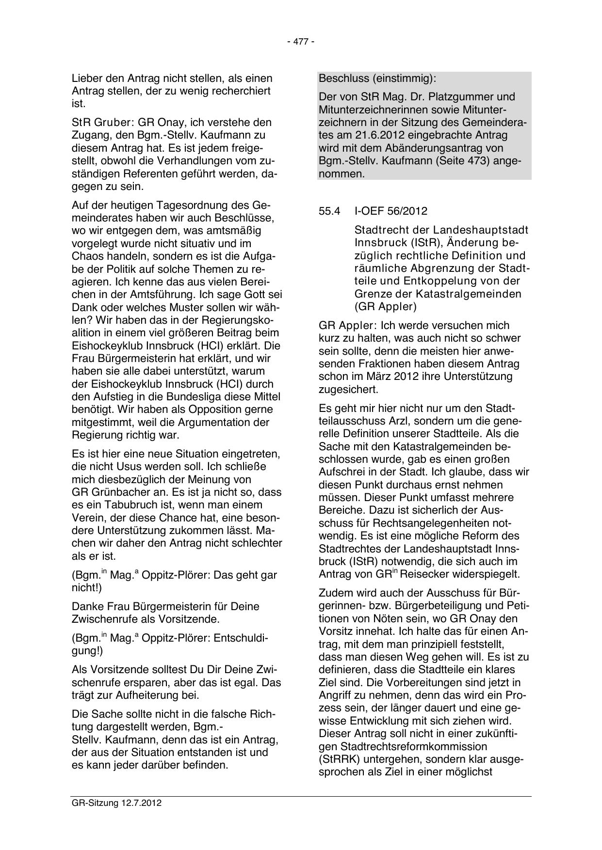 Mitunterzeichnerinnen sowie Mitunterzeichnern in der Sitzung des Gemeinderates am 21.6.2012 eingebrachte Antrag