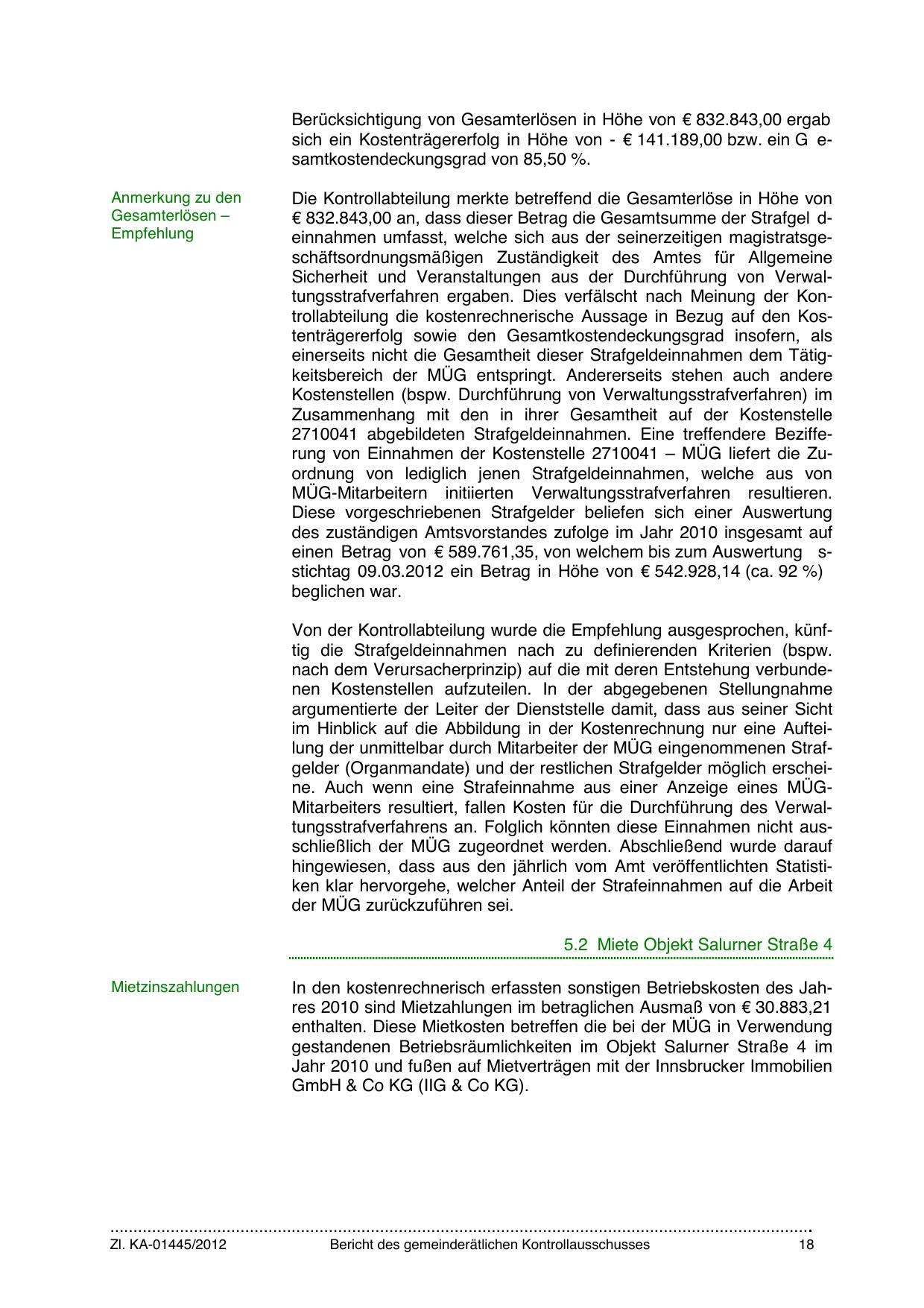 Sicherheit und Veranstaltungen aus der Durchführung von Verwaltungsstrafverfahren ergaben. Dies verfälscht nach Meinung der Kontrollabteilung die kostenrechnerische Aussage in Bezug auf den Kostenträgererfolg sowie den Gesamtkostendeckungsgrad insofern, als