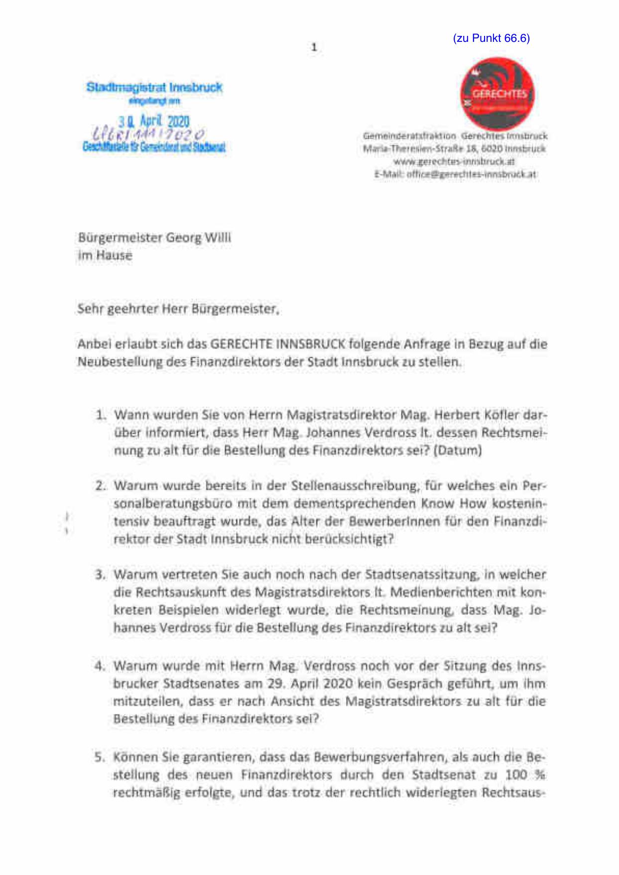 Anbei erlaubt sich das GERECHTE INNSBRUCK folgende Anfrage in Bezug auf die