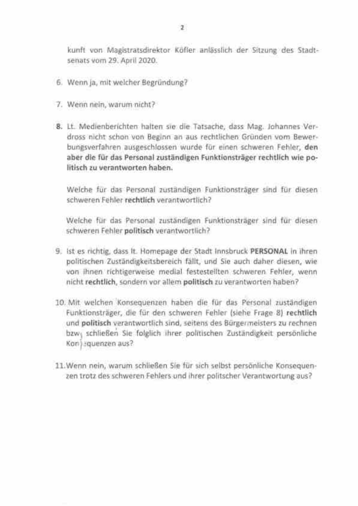 8. Lt. Medienberichten halten sie die Tatsache, dass Mag. Johannes Ver dross nicht schon von Beginn an aus rechtlichen Gr ünden vom Bewer bungsverfahren ausgeschlossen wurde f ür einen schweren Fehler, den