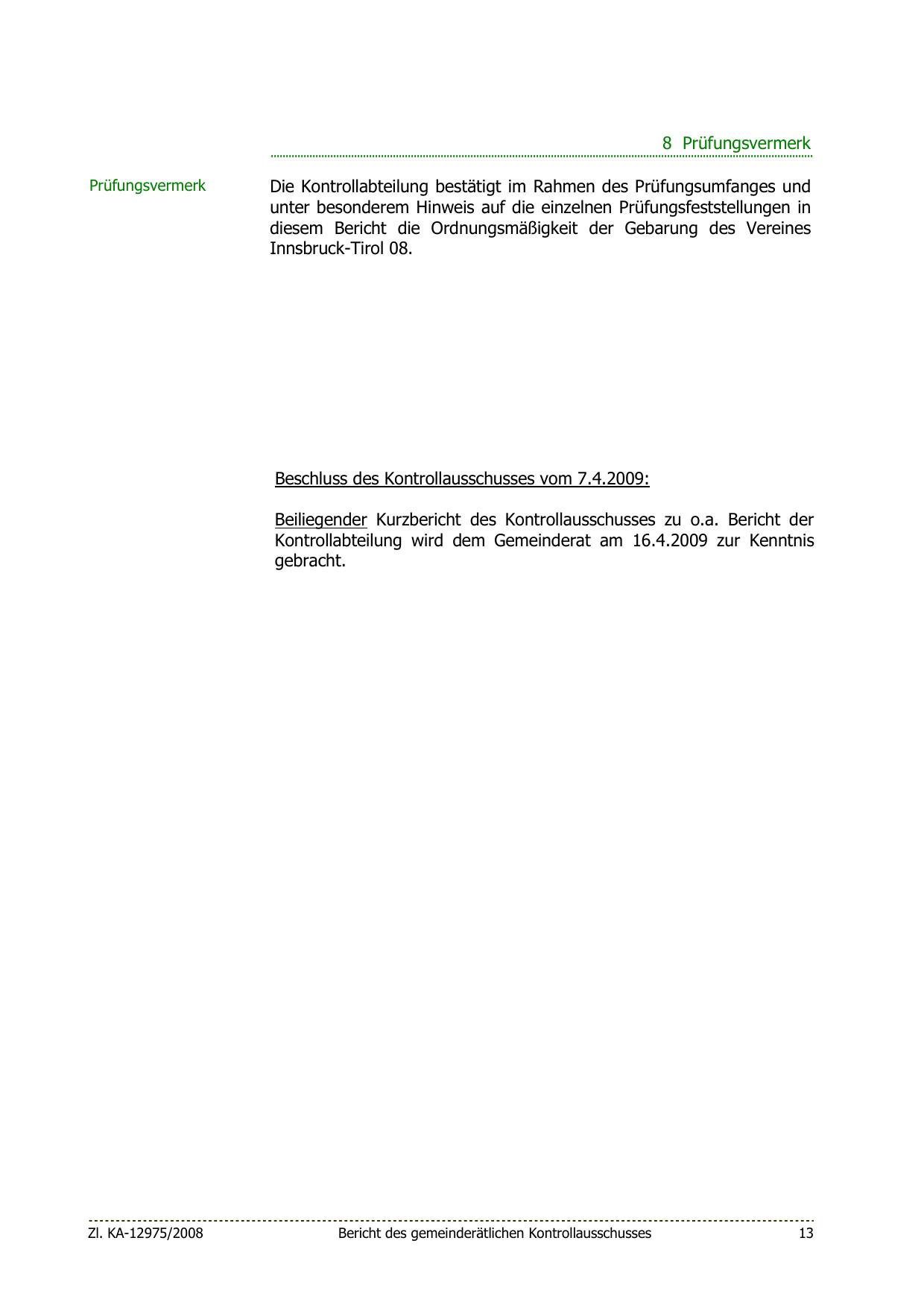 Beschluss des Kontrollausschusses vom 7.4.2009: