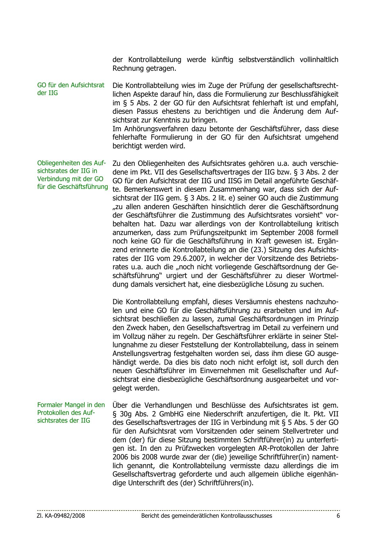 noch keine GO für die Geschäftsführung in Kraft gewesen ist. Ergänzend erinnerte die Kontrollabteilung an die (23.) Sitzung des Aufsichtsrates der IIG vom 29.6.2007, in welcher der Vorsitzende des Betriebsrates u.a. auch die „noch nicht vorliegende Geschäftsordnung der Geschäftsführung“ urgiert und der Geschäftsführer zu dieser Wortmeldung damals versichert hat, eine diesbezügliche Lösung zu suchen.