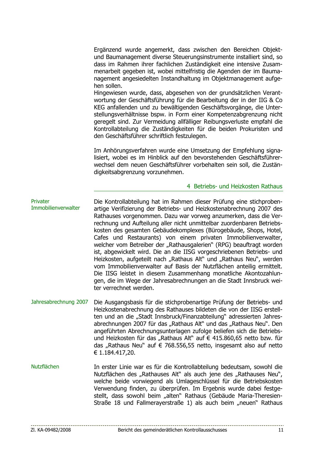 Heizkostenabrechnung des Rathauses bildeten die von der IISG erstellten und an die „Stadt Innsbruck/Finanzabteilung“ adressierten Jahresabrechnungen 2007 für das „Rathaus Alt“ und das „Rathaus Neu“. Den