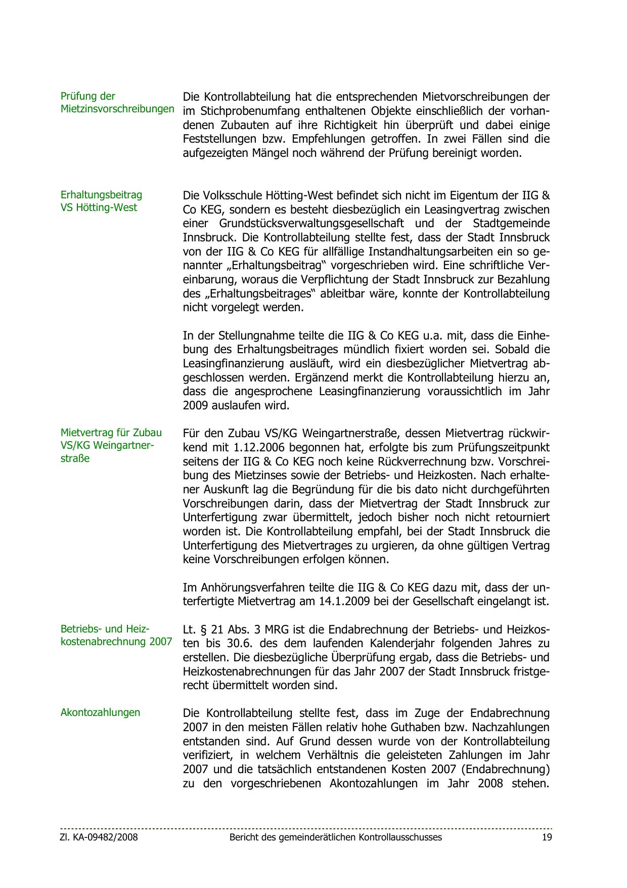 von der IIG & Co KEG für allfällige Instandhaltungsarbeiten ein so genannter „Erhaltungsbeitrag“ vorgeschrieben wird. Eine schriftliche Vereinbarung, woraus die Verpflichtung der Stadt Innsbruck zur Bezahlung