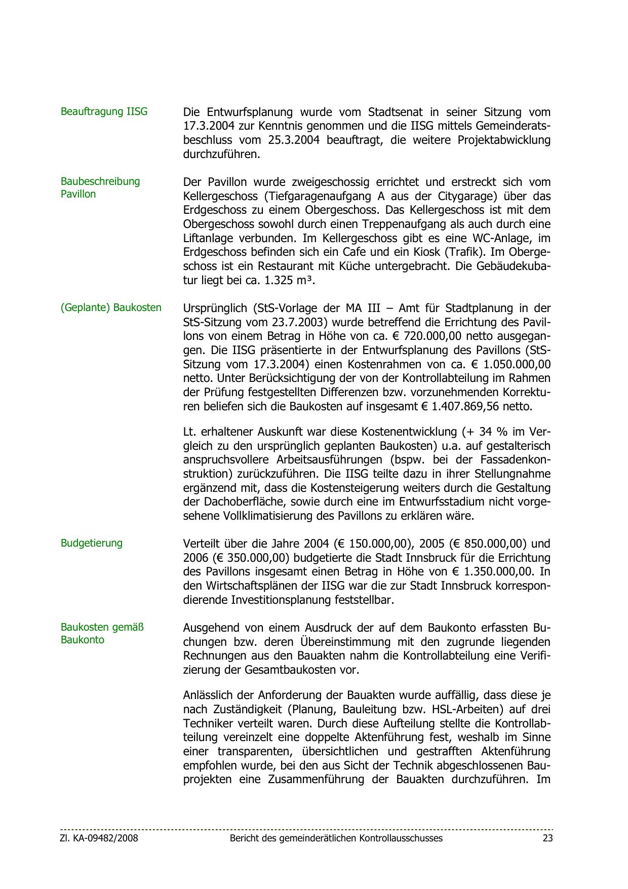 StS-Sitzung vom 23.7.2003) wurde betreffend die Errichtung des Pavillons von einem Betrag in Höhe von ca. € 720.000,00 netto ausgegangen. Die IISG präsentierte in der Entwurfsplanung des Pavillons (StSSitzung vom 17.3.2004) einen Kostenrahmen von ca. € 1.050.000,00