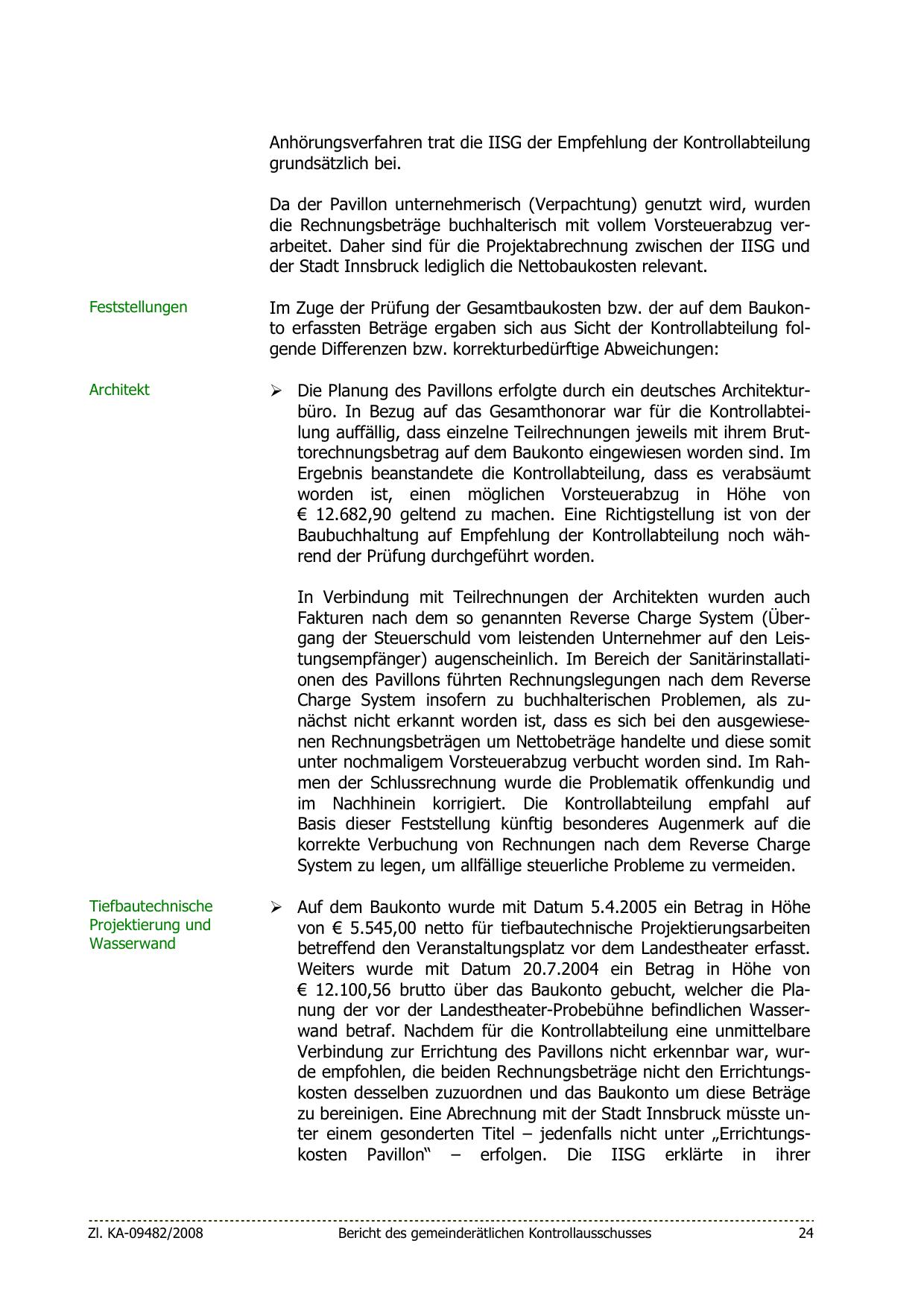 zu bereinigen. Eine Abrechnung mit der Stadt Innsbruck müsste unter einem gesonderten Titel – jedenfalls nicht unter „Errichtungskosten Pavillon“ – erfolgen. Die IISG erklärte in ihrer