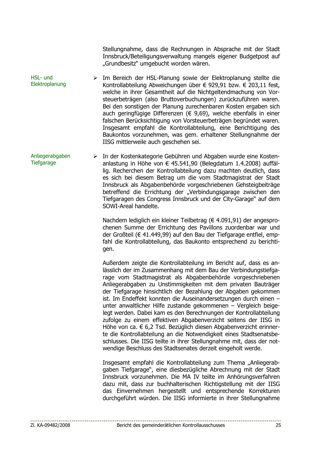 Höhe von ca. € 6,2 Tsd. Bezüglich diesen Abgabenverzicht erinnerte die Kontrollabteilung an die Notwendigkeit eines Stadtsenatsbeschlusses. Die IISG teilte in ihrer Stellungnahme mit, dass der notwendige Beschluss des Stadtsenates derzeit eingeholt werde.