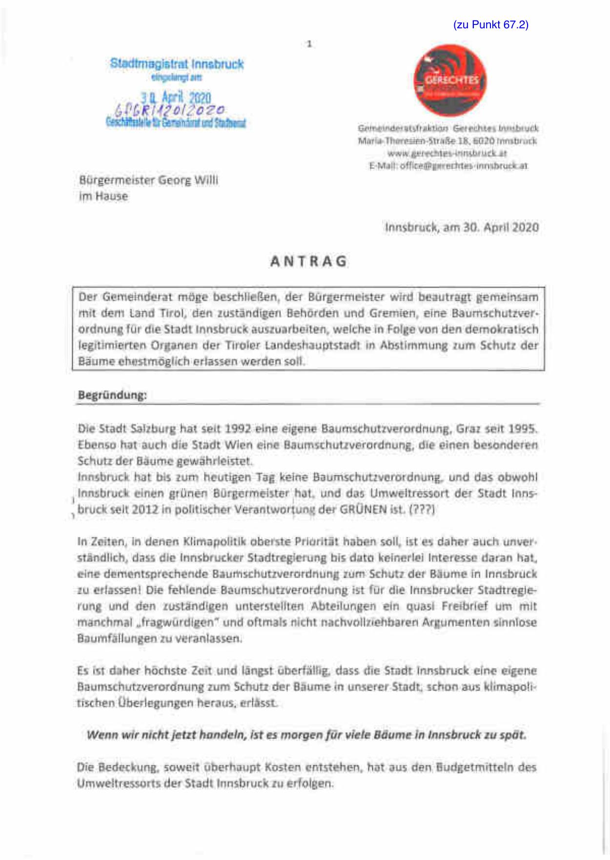 mit dem Land Tirol, den zust ä ndigen Beh örden und Gremien, eine Baumschutzver ordnung f ü r die Stadt Innsbruck auszuarbeiten, welche in Folge von den demokratisch