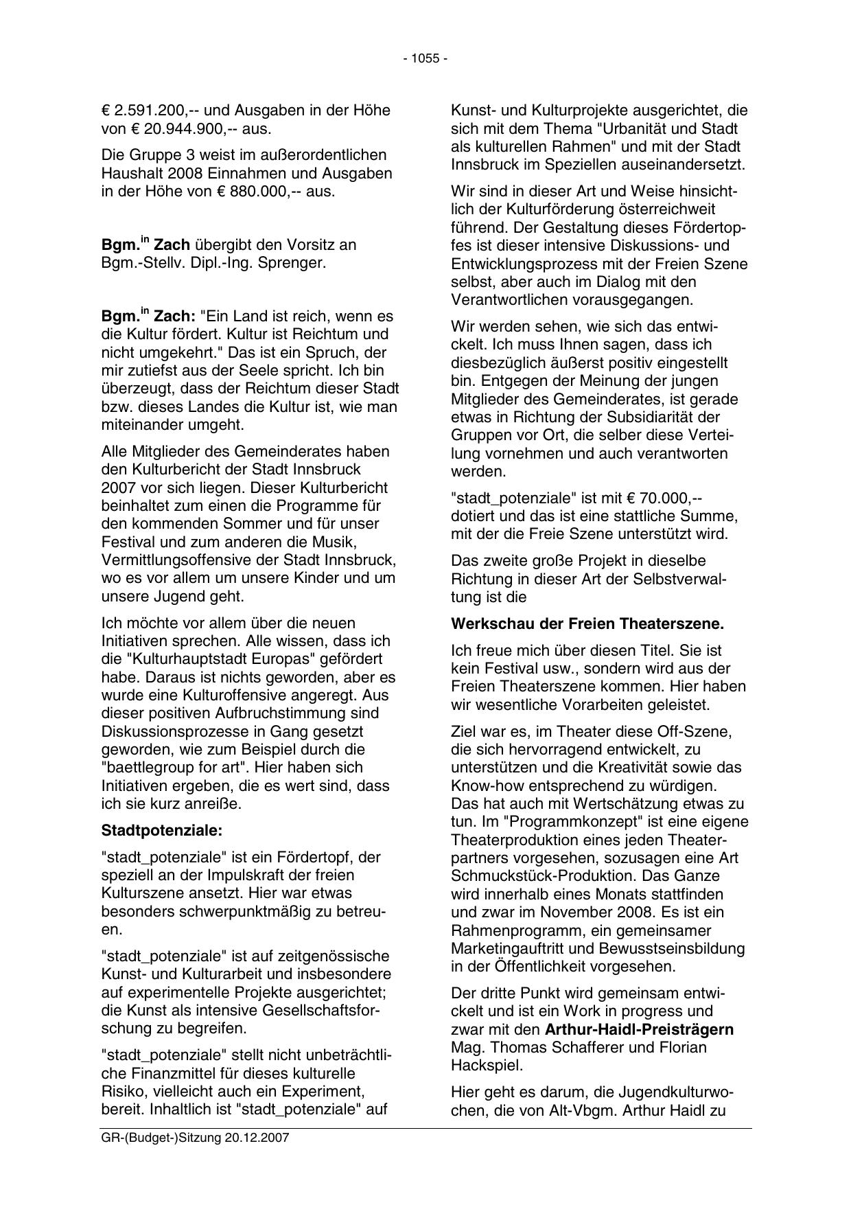 Hier geht es darum, die Jugendkulturwochen, die von Alt-Vbgm. Arthur Haidl zu