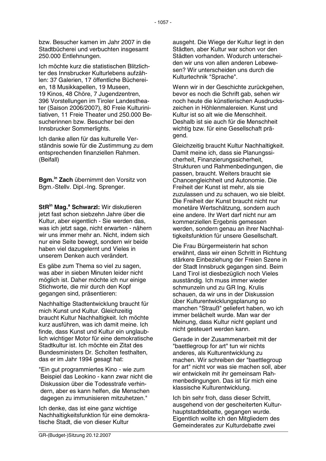 Ich möchte kurz die statistischen Blitzlichter des Innsbrucker Kulturlebens aufzählen: 37 Galerien, 17 öffentliche Büchereien, 18 Musikkapellen, 19 Museen,