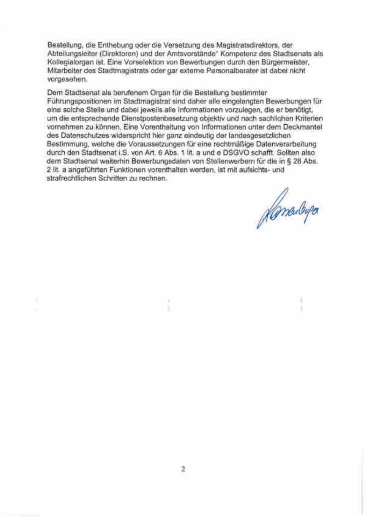 dem Stadtsenat weiterhin Bewerbungsdaten von Stellenwerbern für die in § 28 Abs.