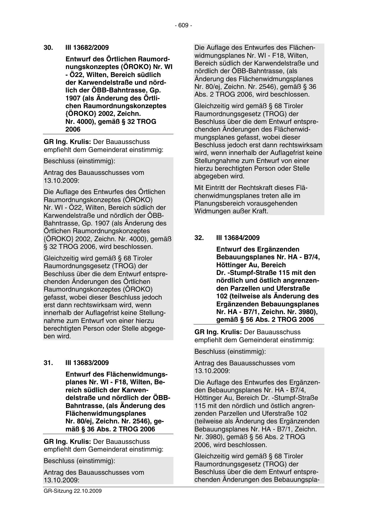 Die Auflage des Entwurfes des Flächenwidmungsplanes Nr. WI - F18, Wilten,
