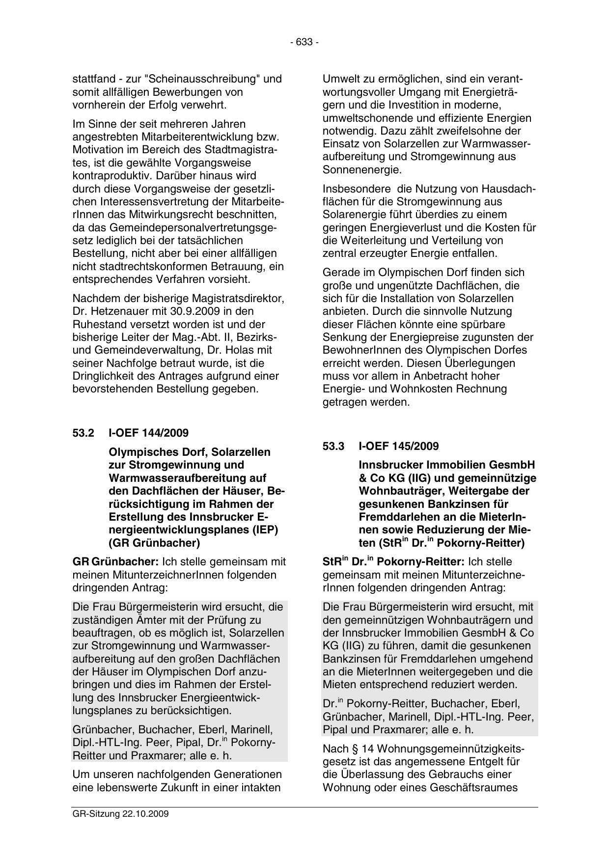 der Häuser im Olympischen Dorf anzubringen und dies im Rahmen der Erstellung des Innsbrucker Energieentwicklungsplanes zu berücksichtigen.