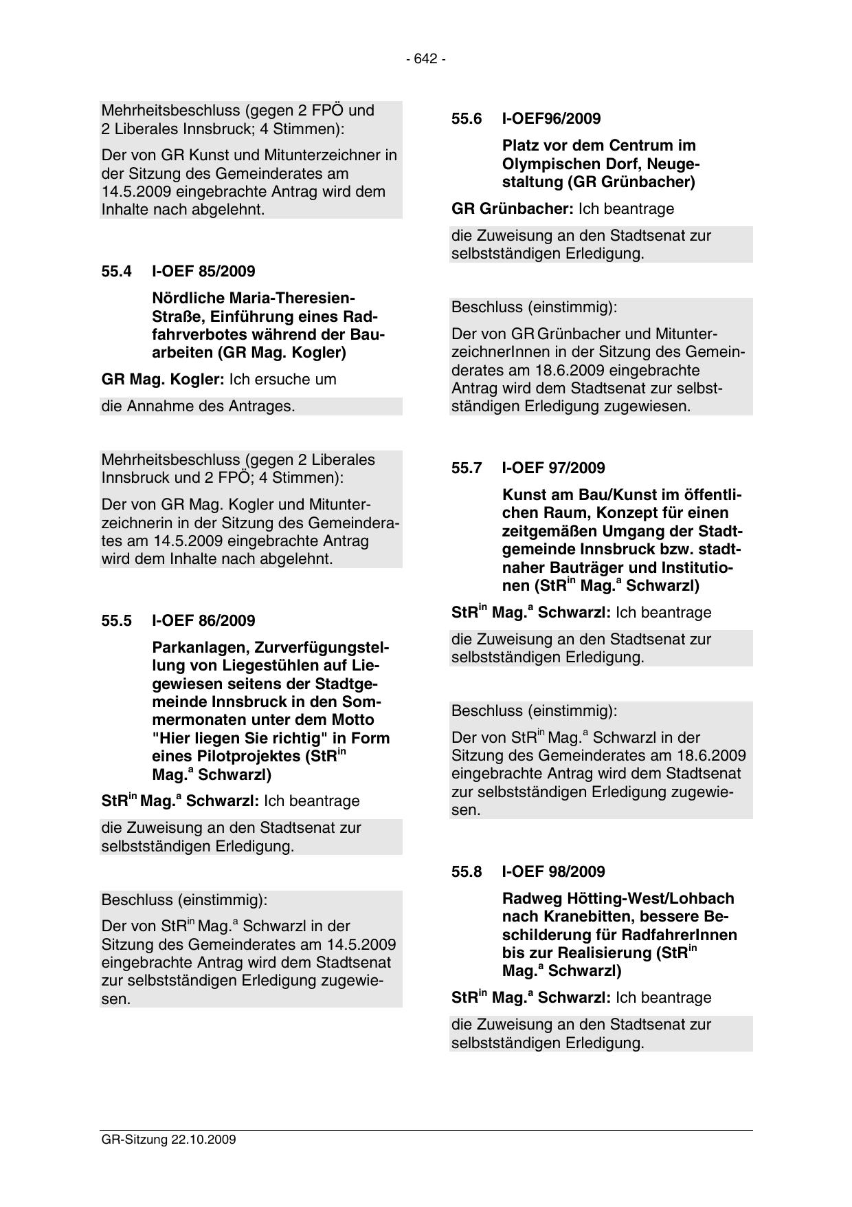 Der von GR Grünbacher und MitunterzeichnerInnen in der Sitzung des Gemeinderates am 18.6.2009 eingebrachte