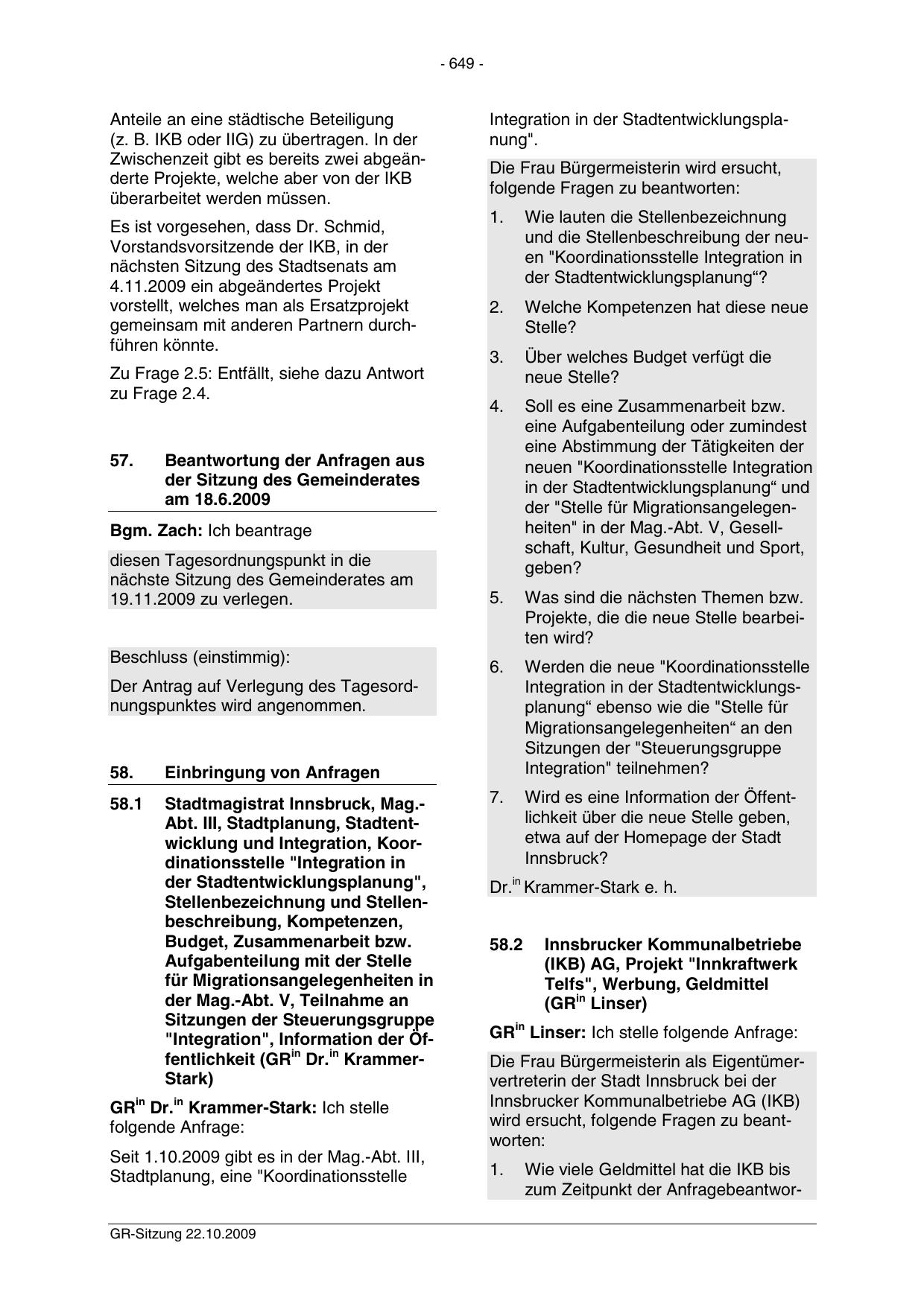 Die Frau Bürgermeisterin als Eigentümervertreterin der Stadt Innsbruck bei der