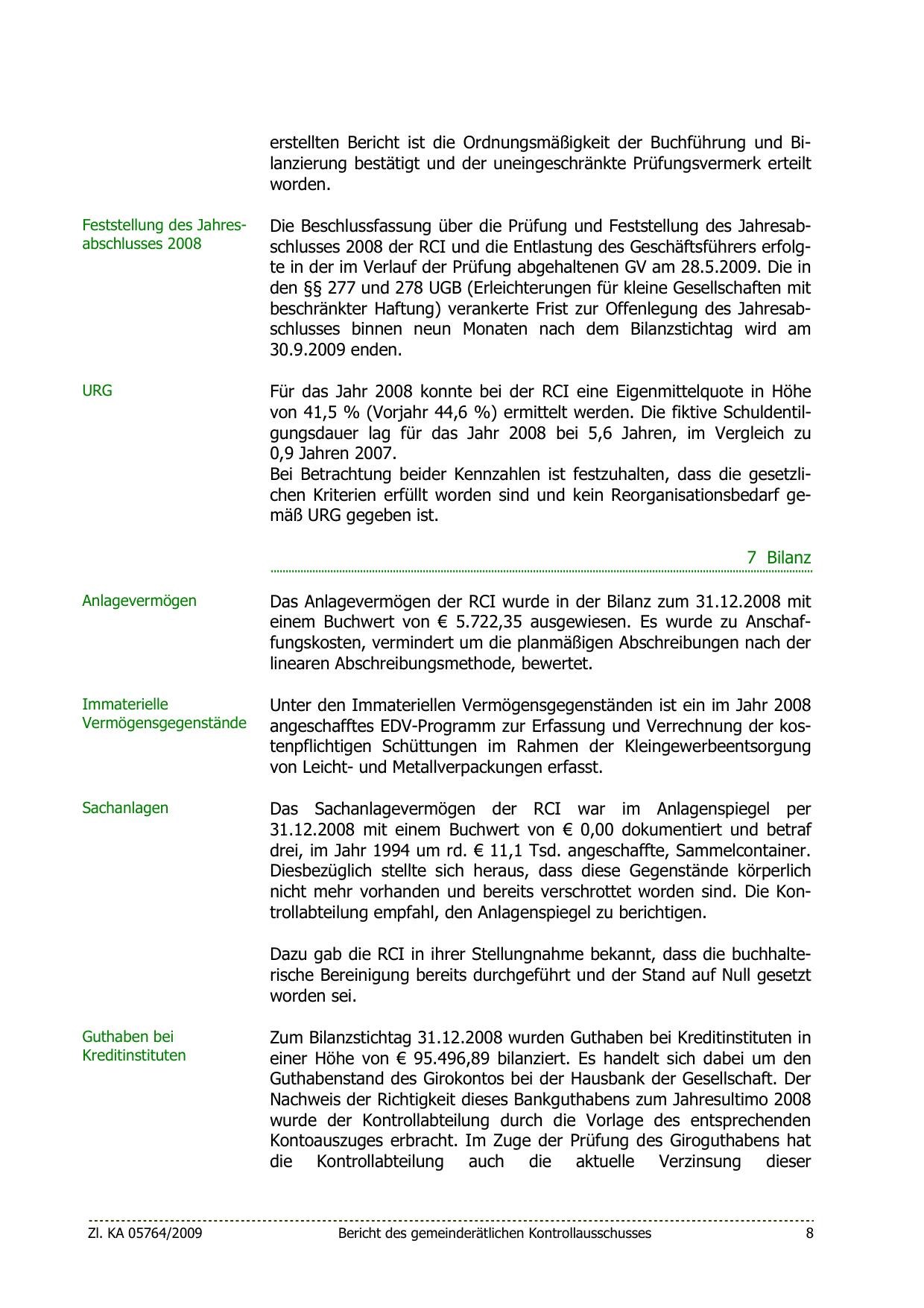 Die Beschlussfassung über die Prüfung und Feststellung des Jahresabschlusses 2008 der RCI und die Entlastung des Geschäftsführers erfolgte in der im Verlauf der Prüfung abgehaltenen GV am 28.5.2009. Die in