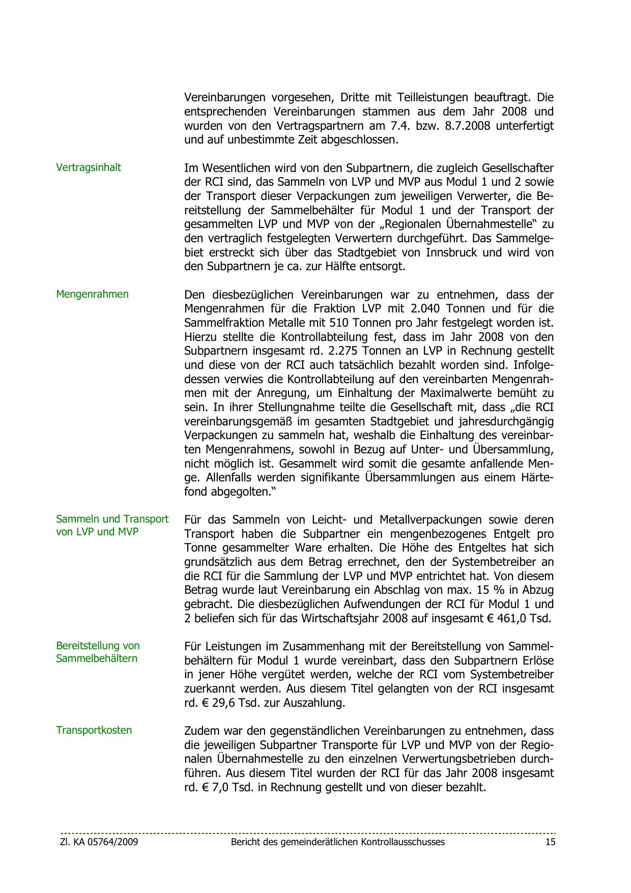 die jeweiligen Subpartner Transporte für LVP und MVP von der Regionalen Übernahmestelle zu den einzelnen Verwertungsbetrieben durchführen. Aus diesem Titel wurden der RCI für das Jahr 2008 insgesamt