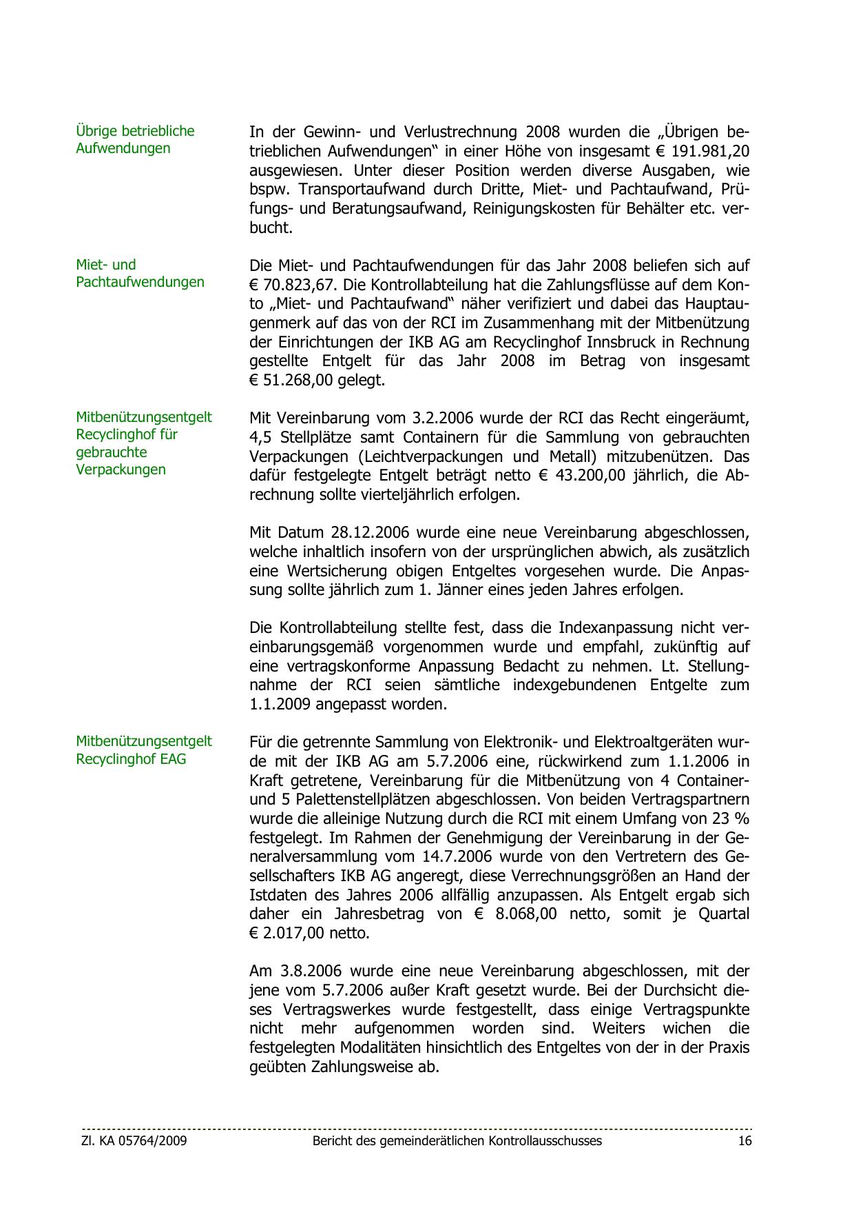 € 70.823,67. Die Kontrollabteilung hat die Zahlungsflüsse auf dem Konto „Miet- und Pachtaufwand“ näher verifiziert und dabei das Hauptaugenmerk auf das von der RCI im Zusammenhang mit der Mitbenützung