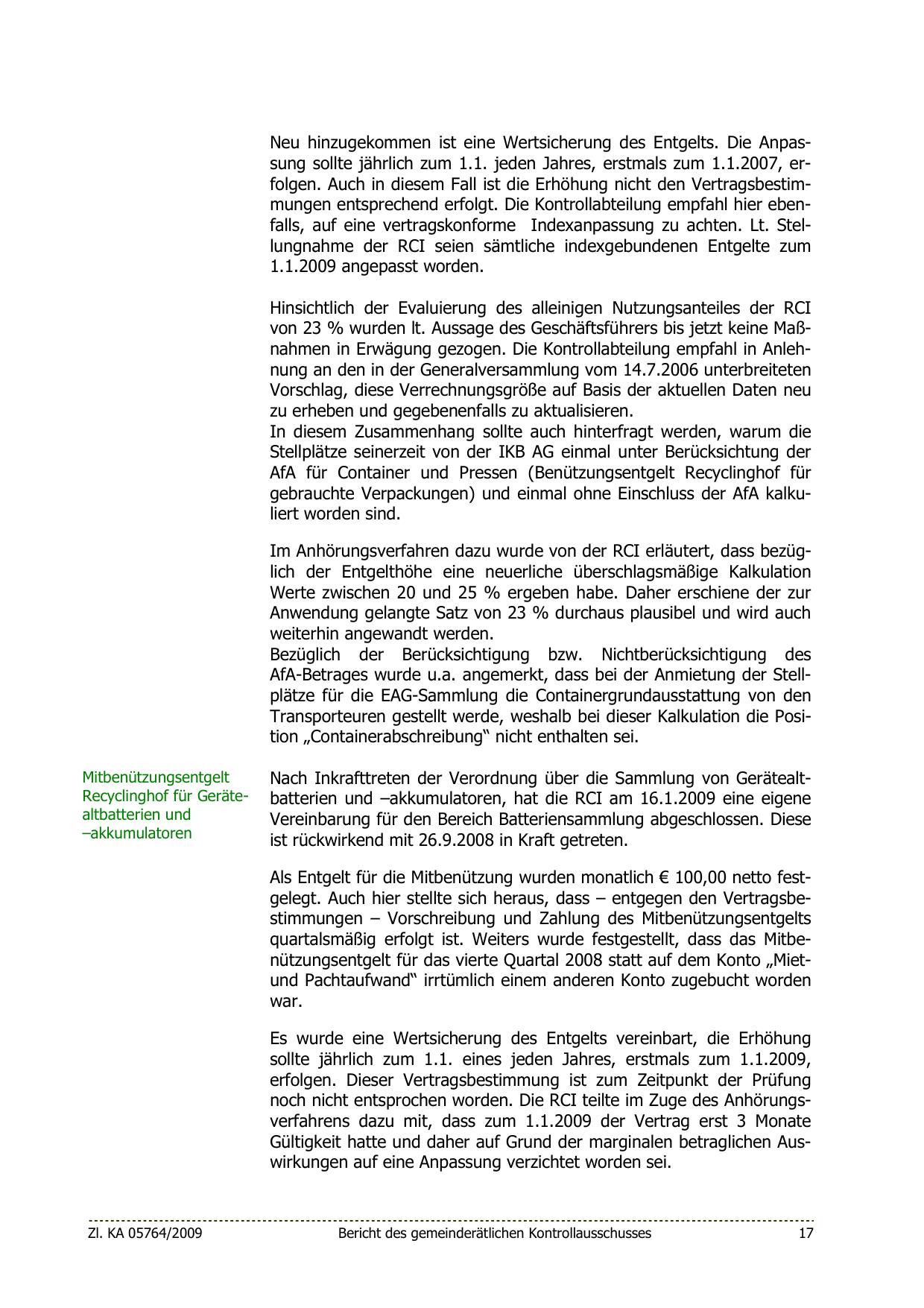 Neu hinzugekommen ist eine Wertsicherung des Entgelts. Die Anpassung sollte jährlich zum 1.1. jeden Jahres, erstmals zum 1.1.2007, erfolgen. Auch in diesem Fall ist die Erhöhung nicht den Vertragsbestimmungen entsprechend erfolgt. Die Kontrollabteilung empfahl hier ebenfalls, auf eine vertragskonforme Indexanpassung zu achten. Lt. Stellungnahme der RCI seien sämtliche indexgebundenen Entgelte zum