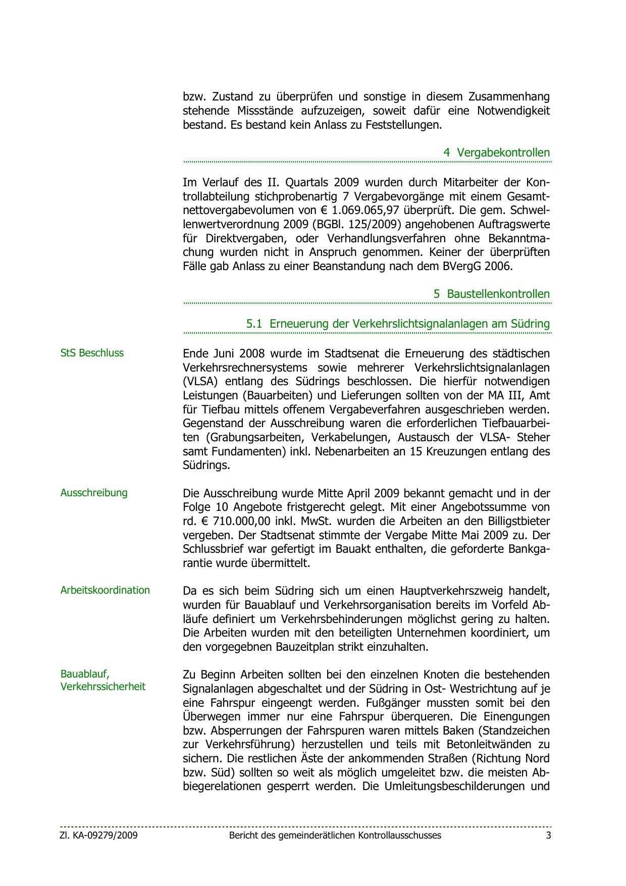 Im Verlauf des II. Quartals 2009 wurden durch Mitarbeiter der Kontrollabteilung stichprobenartig 7 Vergabevorgänge mit einem Gesamtnettovergabevolumen von € 1.069.065,97 überprüft. Die gem. Schwellenwertverordnung 2009 (BGBl. 125/2009) angehobenen Auftragswerte