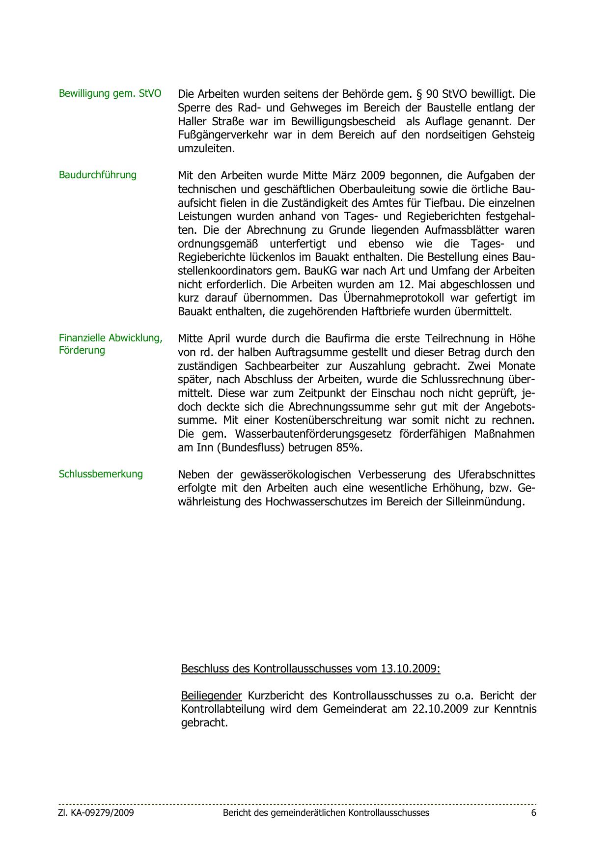 Beschluss des Kontrollausschusses vom 13.10.2009: