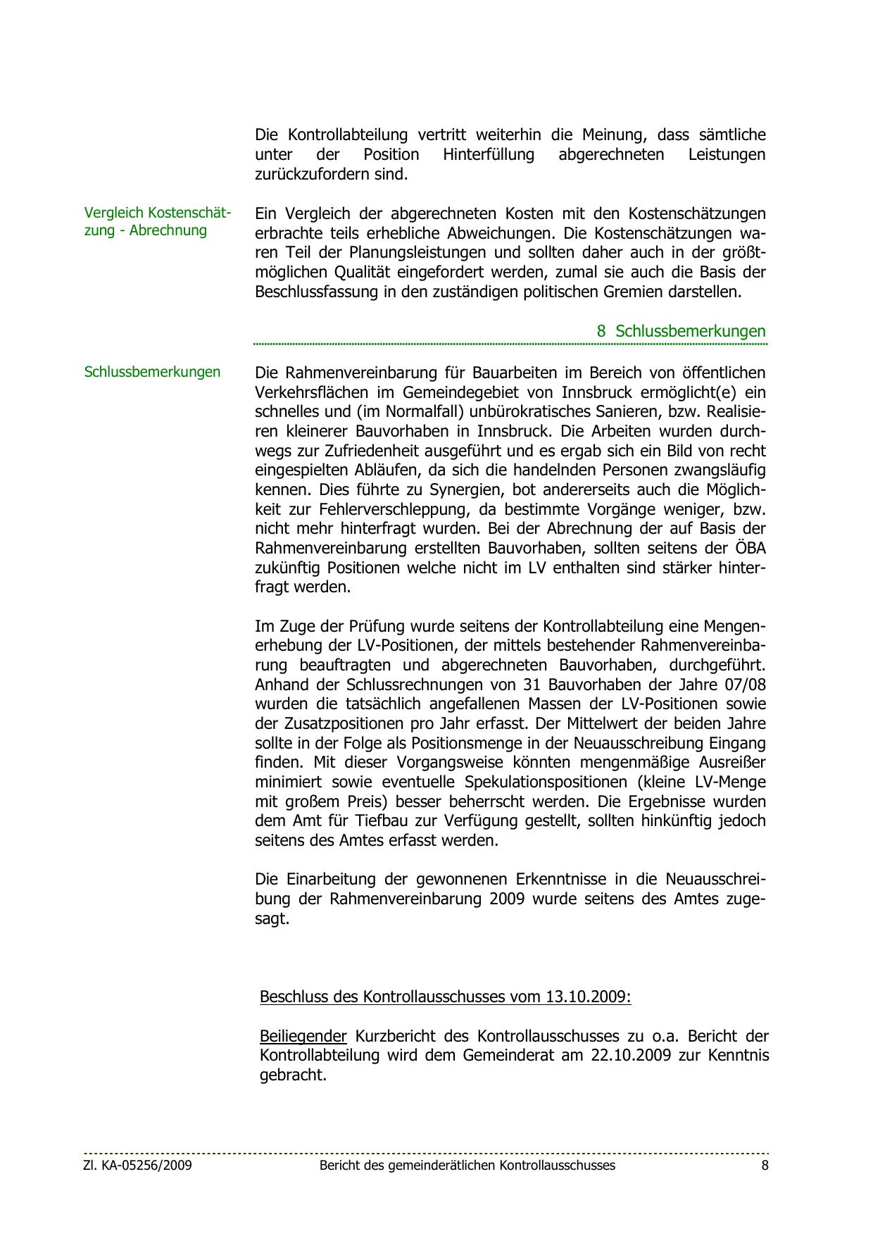 Die Einarbeitung der gewonnenen Erkenntnisse in die Neuausschreibung der Rahmenvereinbarung 2009 wurde seitens des Amtes zugesagt.