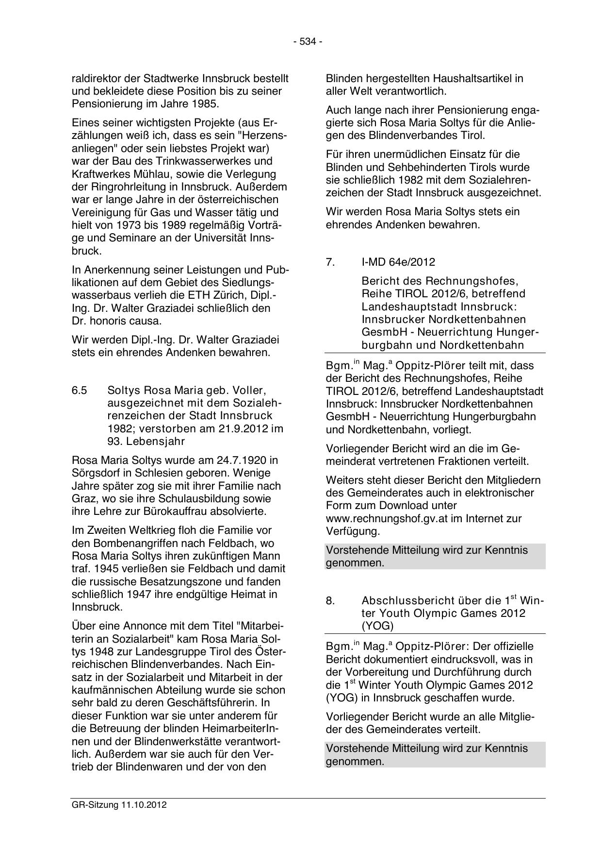 Vorliegender Bericht wurde an alle Mitglieder des Gemeinderates verteilt.