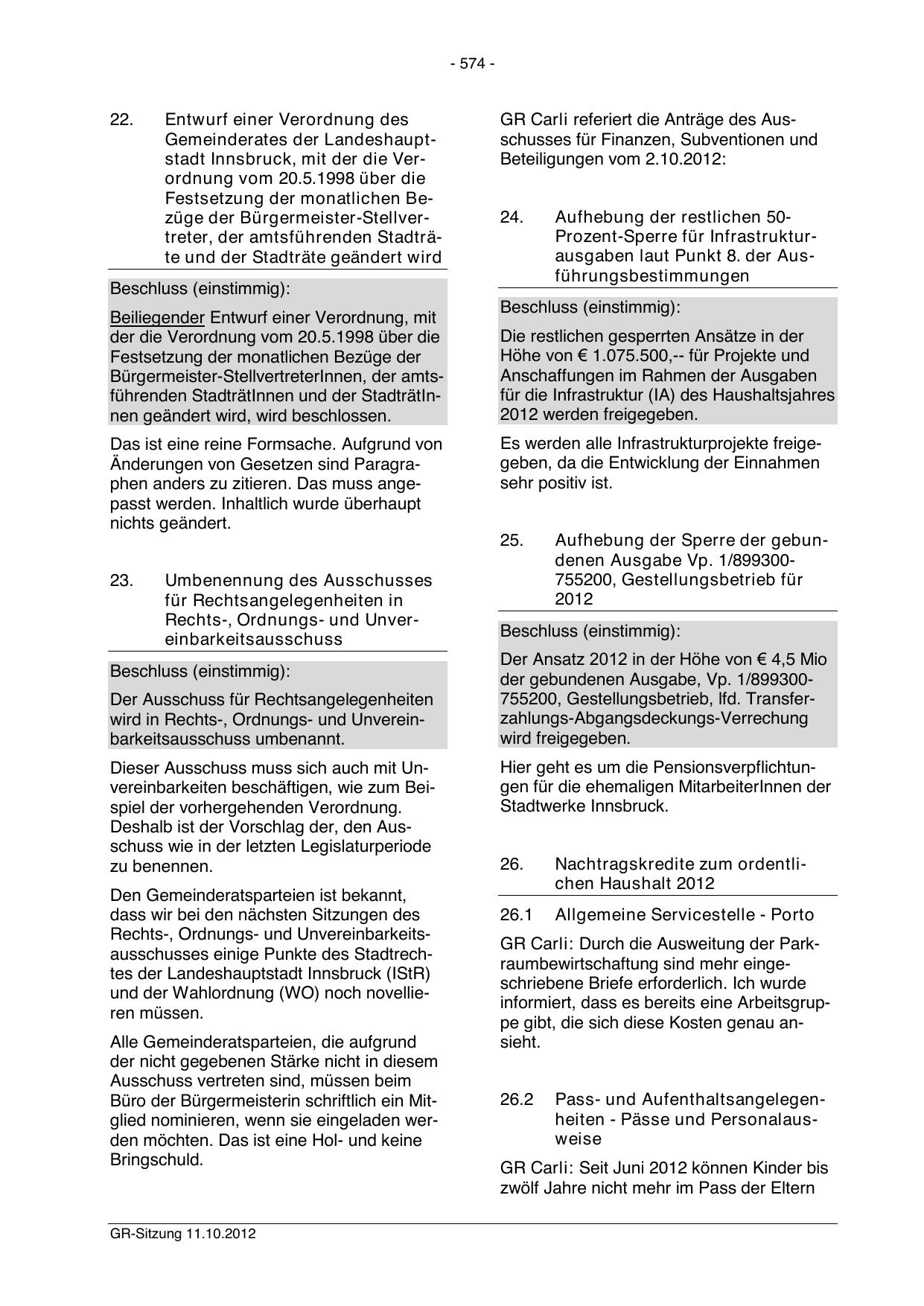 Rechts-, Ordnungs- und Unvereinbarkeitsausschusses einige Punkte des Stadtrechtes der Landeshauptstadt Innsbruck (IStR)