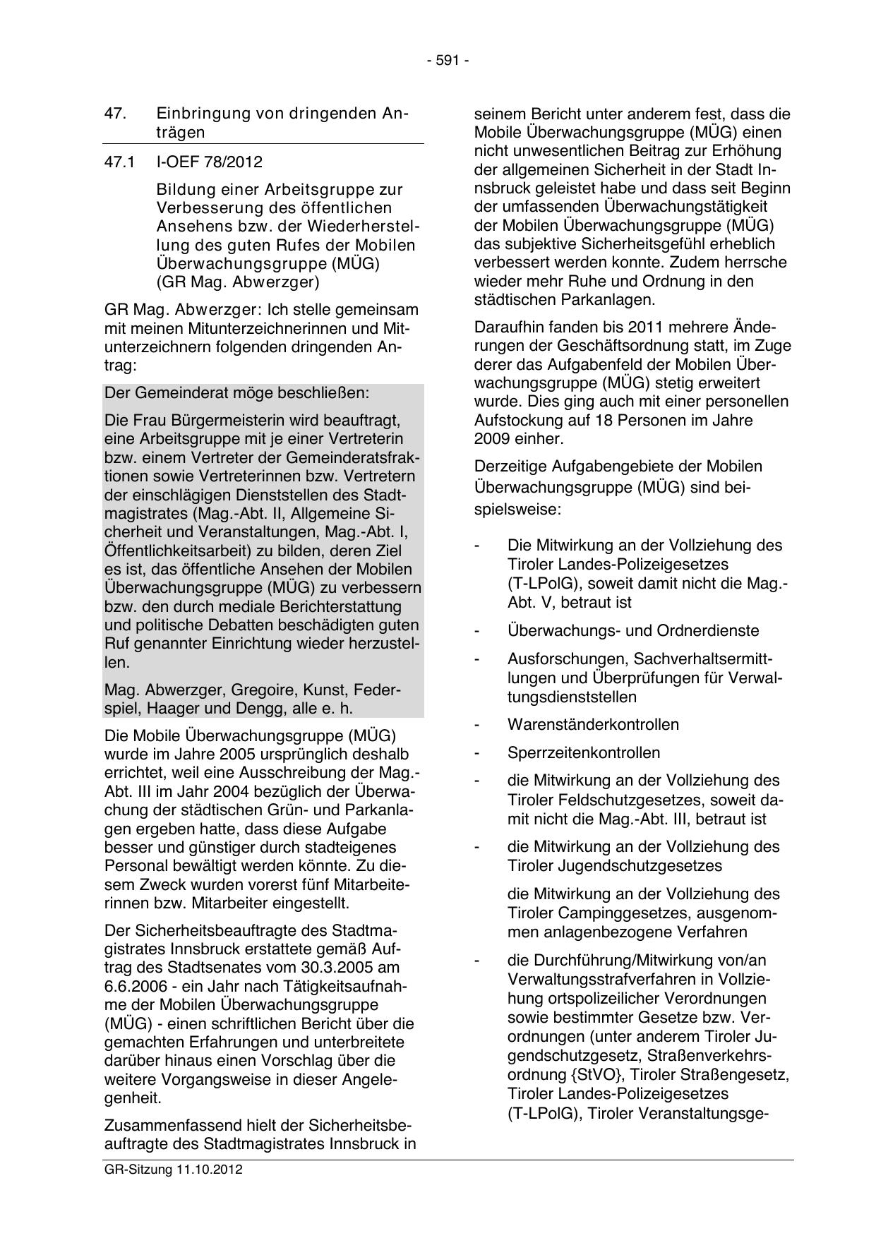 der allgemeinen Sicherheit in der Stadt Innsbruck geleistet habe und dass seit Beginn