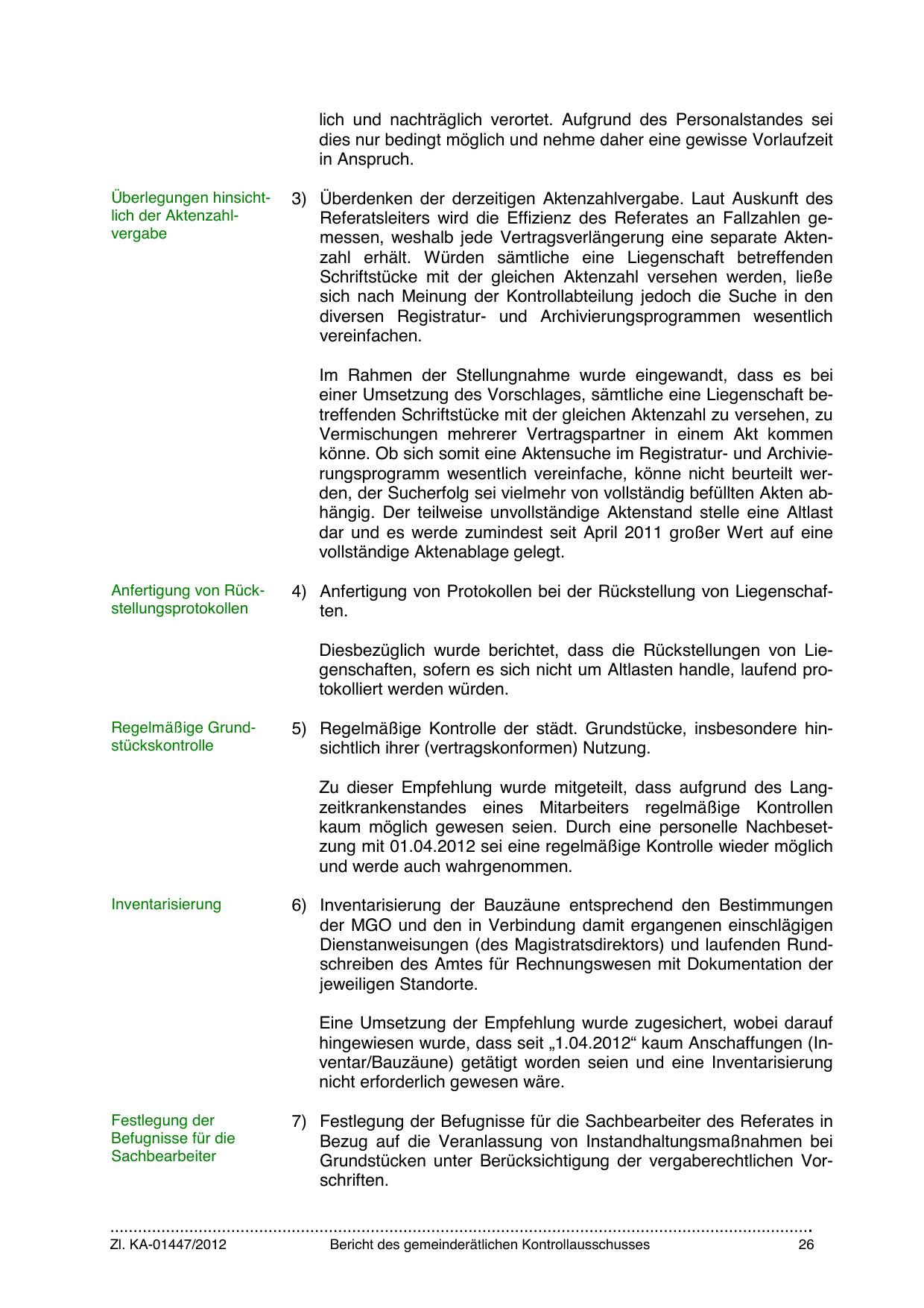 5) Regelmäßige Kontrolle der städt. Grundstücke, insbesondere hinsichtlich ihrer (vertragskonformen) Nutzung.