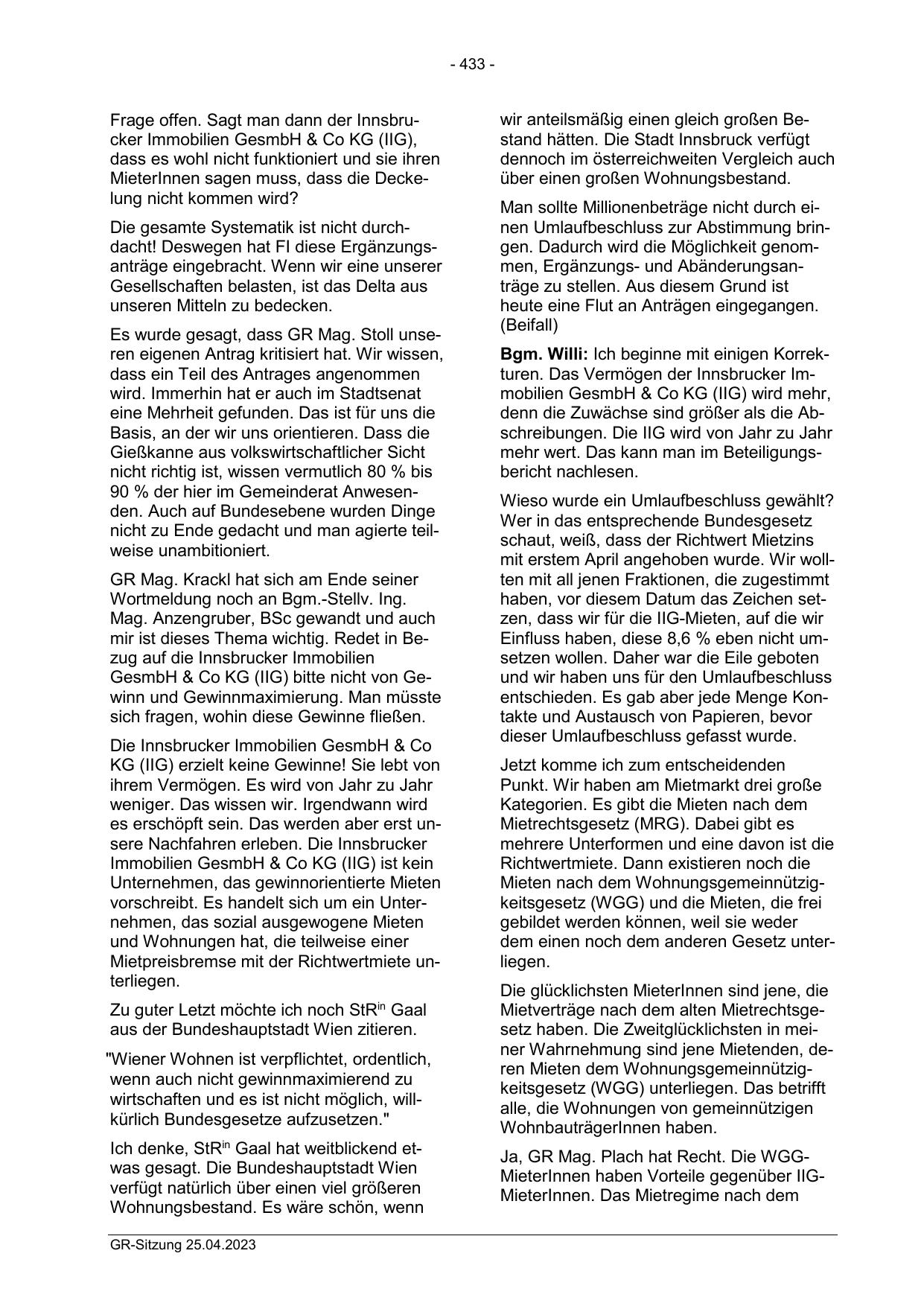 Bgm. Willi: Ich beginne mit einigen Korrekturen. Das Vermögen der Innsbrucker Immobilien GesmbH & Co KG (IIG) wird mehr,
