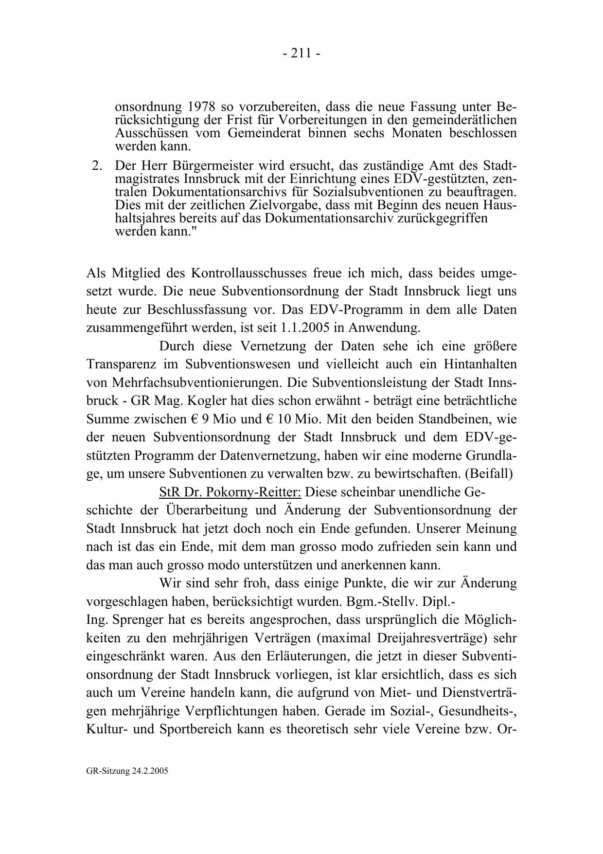 2. Der Herr Bürgermeister wird ersucht, das zuständige Amt des Stadtmagistrates Innsbruck mit der Einrichtung eines EDV-gestützten, zentralen Dokumentationsarchivs für Sozialsubventionen zu beauftragen.