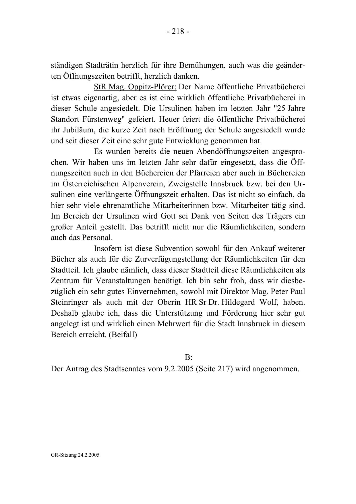Der Antrag des Stadtsenates vom 9.2.2005 (Seite 217) wird angenommen.