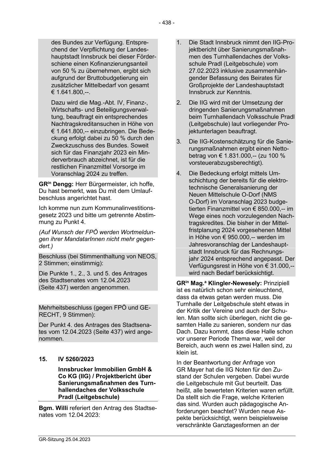 Der Punkt 4. des Antrages des Stadtsenates vom 12.04.2023 (Seite 437) wird angenommen.