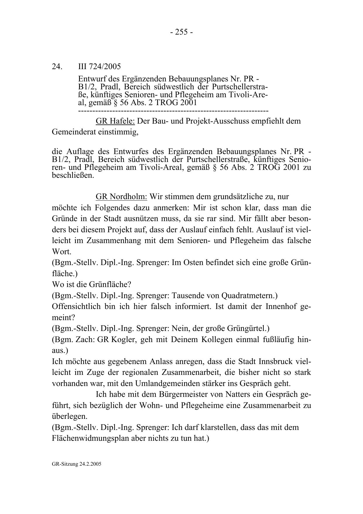 die Auflage des Entwurfes des Ergänzenden Bebauungsplanes Nr. PR B1/2, Pradl, Bereich südwestlich der Purtschellerstraße, künftiges Senioren- und Pflegeheim am Tivoli-Areal, gemäß § 56 Abs. 2 TROG 2001 zu