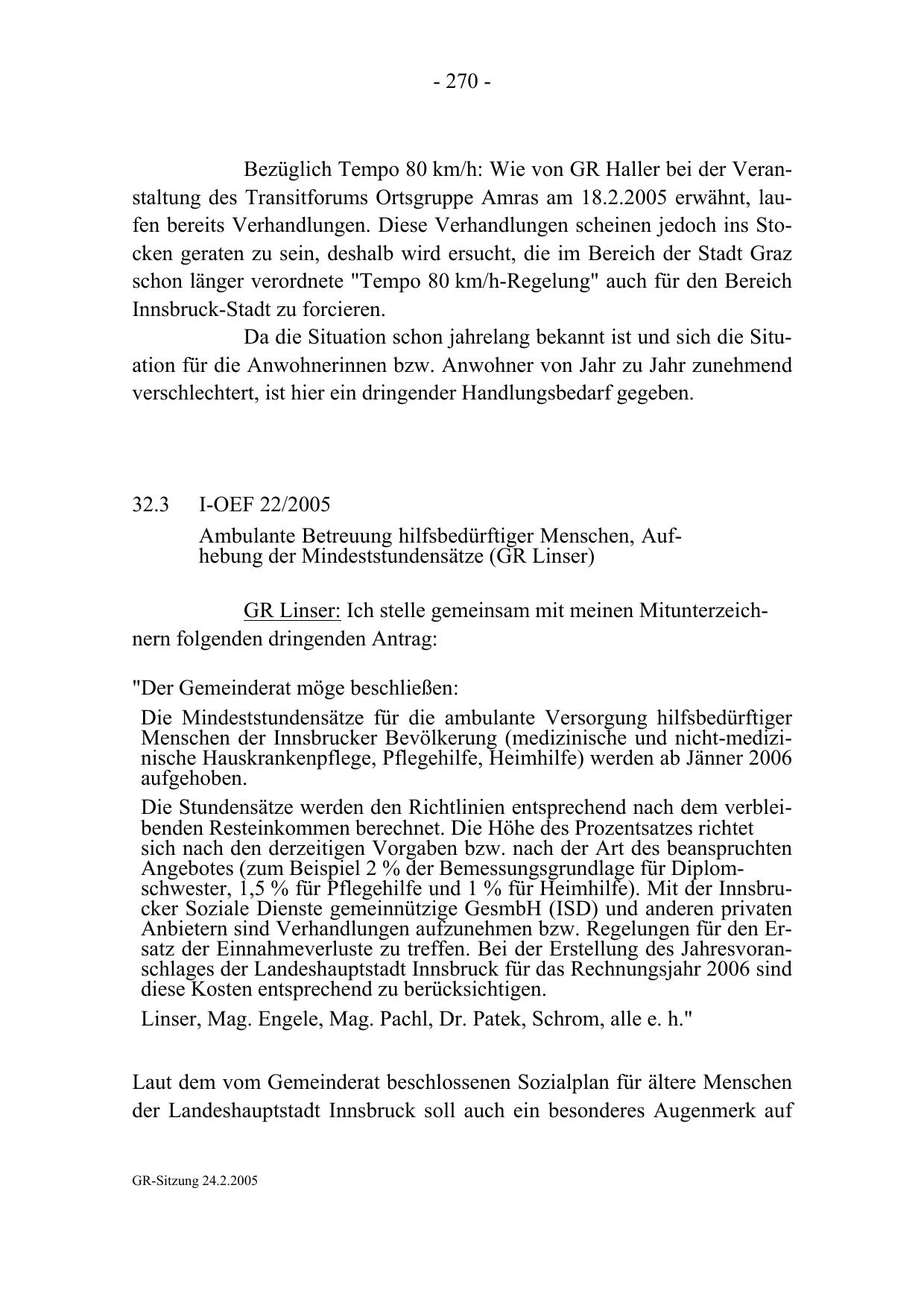 Bezüglich Tempo 80 km/h: Wie von GR Haller bei der Veranstaltung des Transitforums Ortsgruppe Amras am 18.2.2005 erwähnt, laufen bereits Verhandlungen. Diese Verhandlungen scheinen jedoch ins Stocken geraten zu sein, deshalb wird ersucht, die im Bereich der Stadt Graz