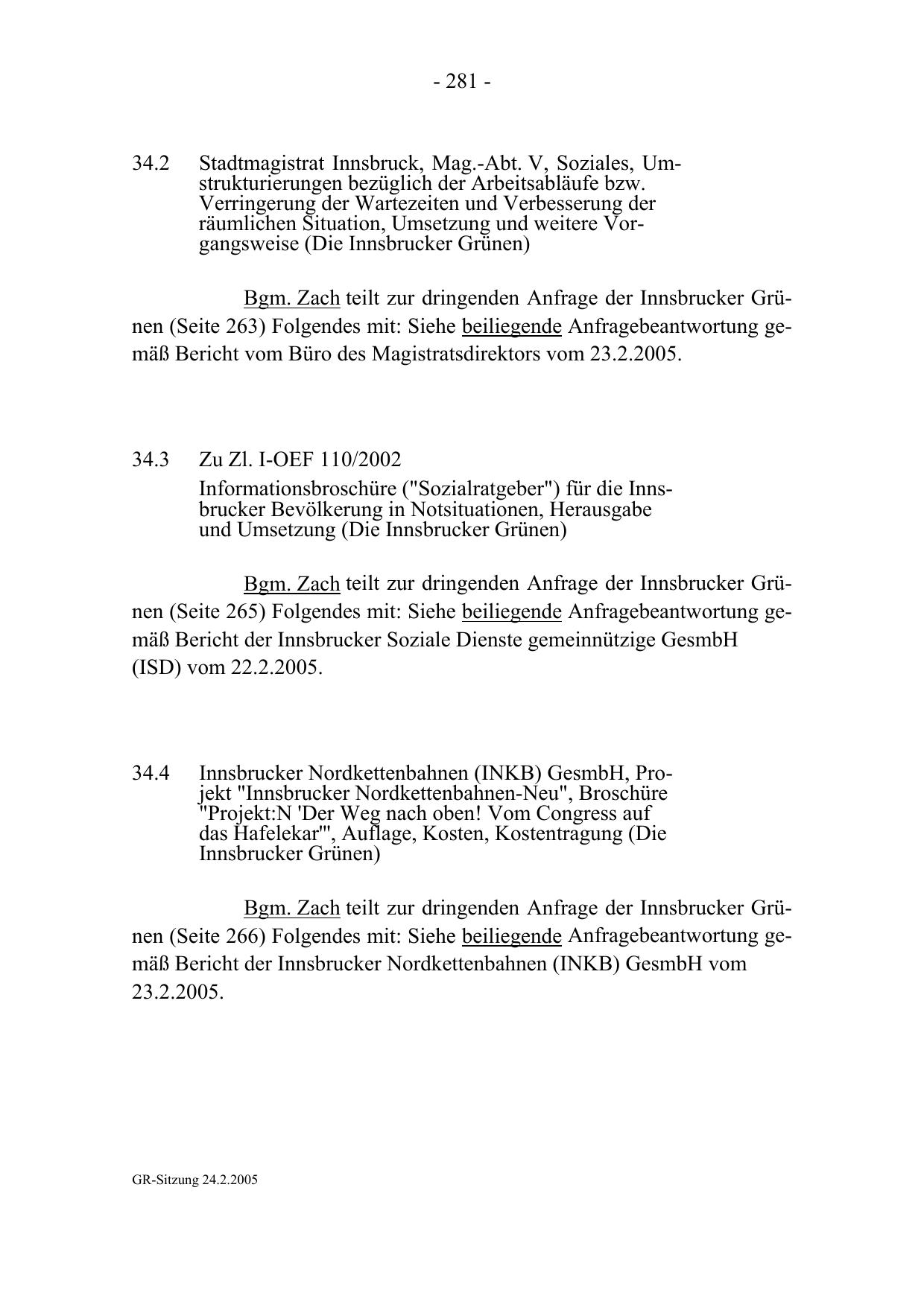 Bgm. Zach teilt zur dringenden Anfrage der Innsbrucker Grünen (Seite 263) Folgendes mit: Siehe beiliegende Anfragebeantwortung gemäß Bericht vom Büro des Magistratsdirektors vom 23.2.2005.