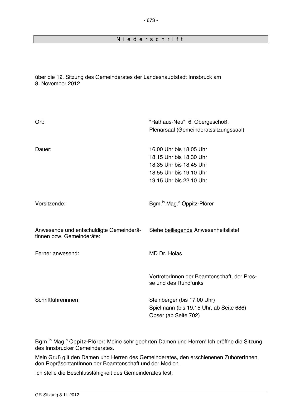 über die 12. Sitzung des Gemeinderates der Landeshauptstadt Innsbruck am