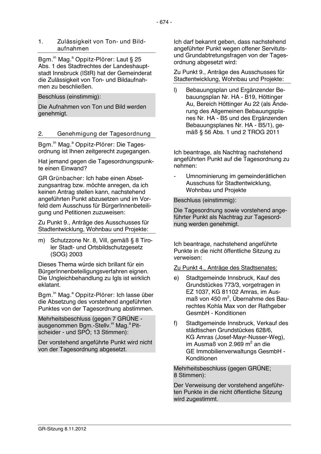 Mehrheitsbeschluss (gegen 7 GRÜNE ausgenommen Bgm.-Stellv.in Mag.a Pitscheider - und SPÖ; 13 Stimmen):