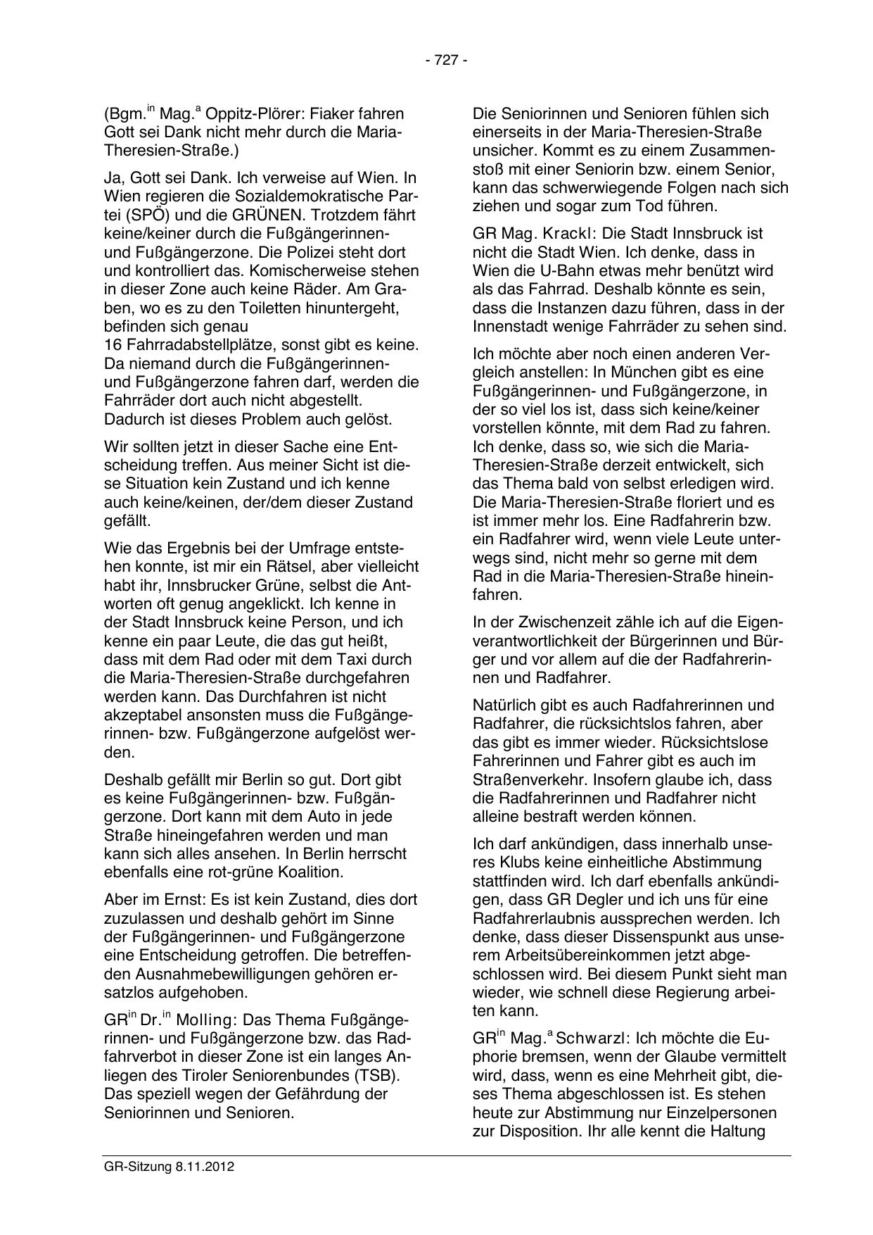 GRin Dr.in Molling: Das Thema Fußgängerinnen- und Fußgängerzone bzw. das Radfahrverbot in dieser Zone ist ein langes Anliegen des Tiroler Seniorenbundes (TSB).