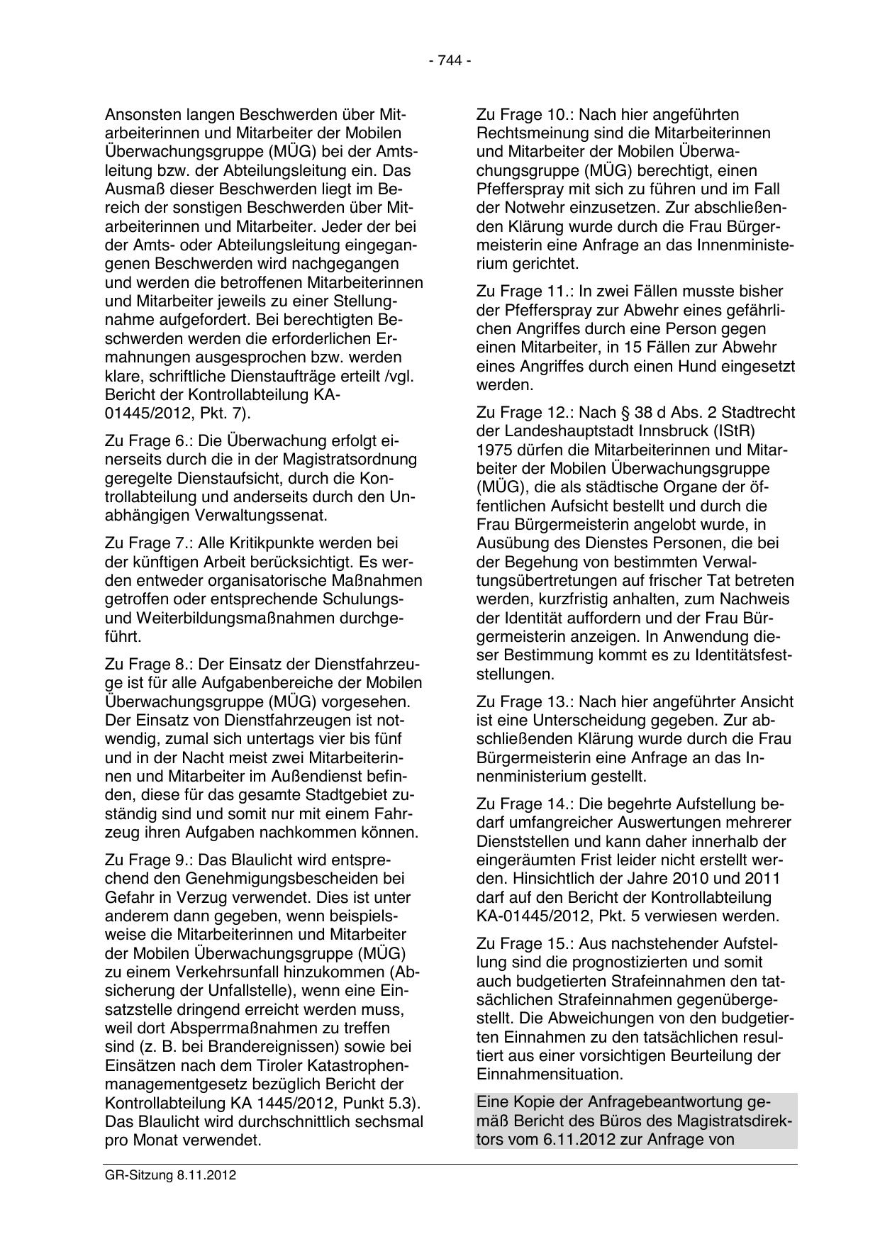 Eine Kopie der Anfragebeantwortung gemäß Bericht des Büros des Magistratsdirektors vom 6.11.2012 zur Anfrage von