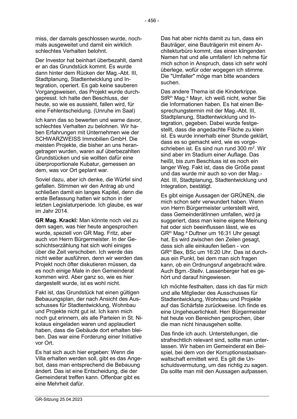 strafrechtlich relevant sind, sollte man unterlassen. Wir haben im Gemeinderat ein Beispiel, bei dem von der Korruptionsstaatsanwaltschaft ermittelt wird. Es gilt die Unschuldsvermutung, um das richtig zu sagen.