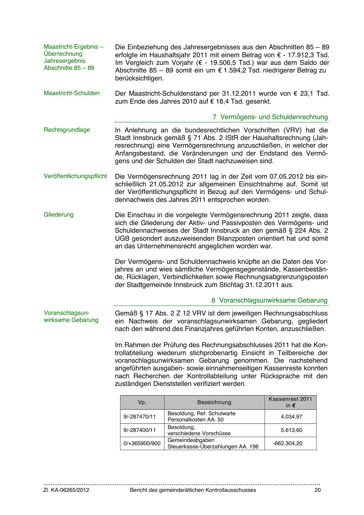Schuldennachweises der Stadt Innsbruck an den gemäß § 224 Abs. 2