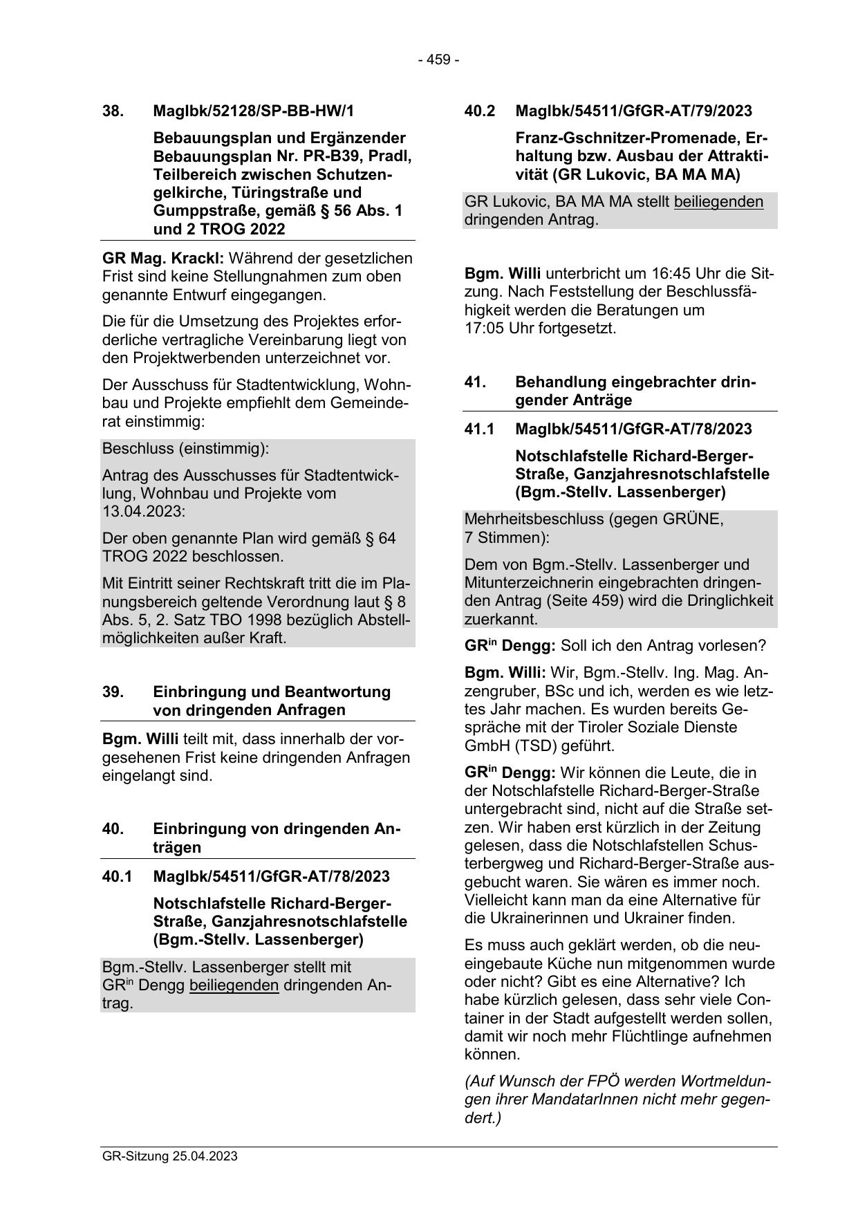 Bgm. Willi teilt mit, dass innerhalb der vorgesehenen Frist keine dringenden Anfragen