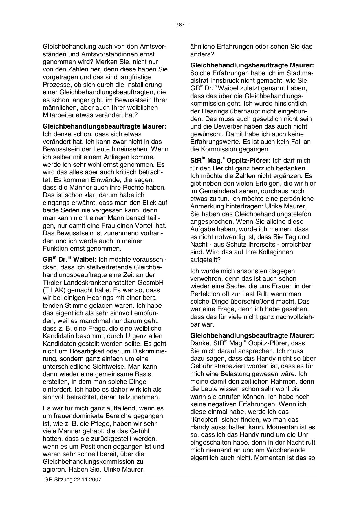 GRin Dr.in Waibel: Ich möchte vorausschicken, dass ich stellvertretende Gleichbehandlungsbeauftragte eine Zeit an der